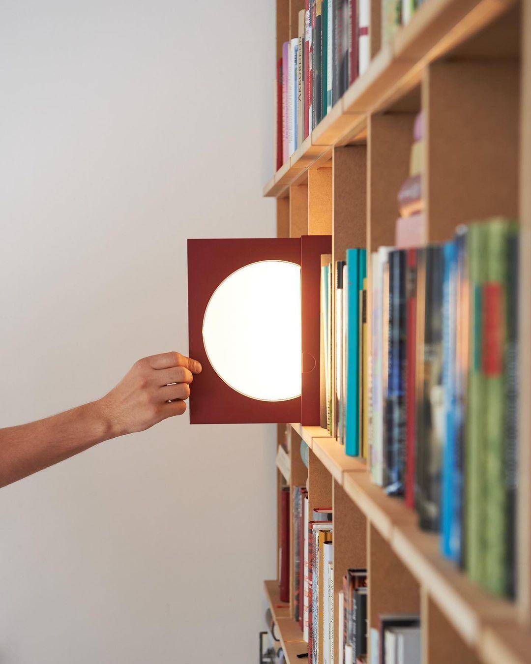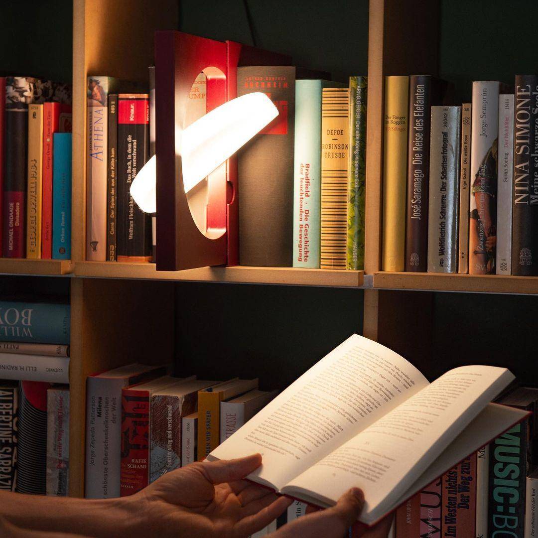 Elina就像一本经典书籍一样站在书架上,并展示了其作为书立架的功能。同时,当你慢慢将其从书架上抽出时,其光盘状的装饰物散发出越来越多的光源。完全拉出时,可以调整照明光盘的角度来调节亮度以用作阅读灯。