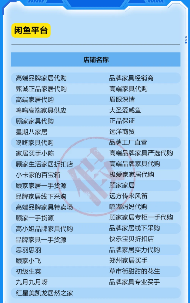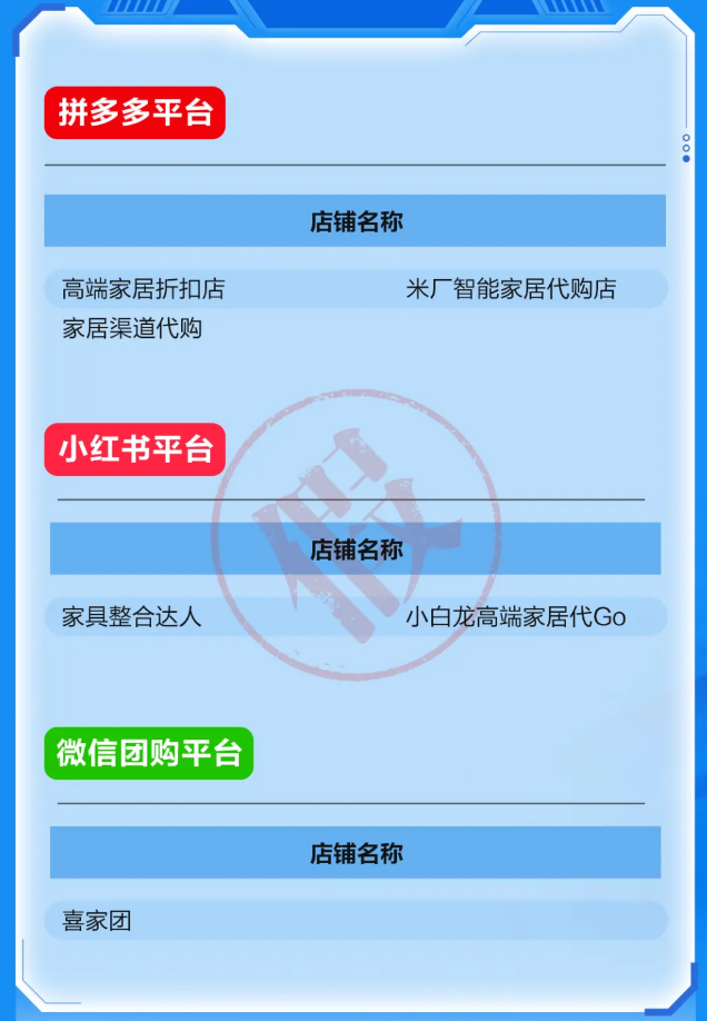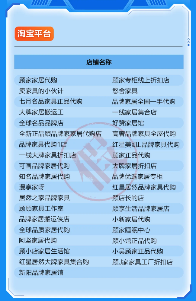 顾家家居列举了84家未授权网店,包括淘宝平台37家、闲鱼平台41家、拼多多平台3家,以及1家小红书店铺及1家微信团购店铺。