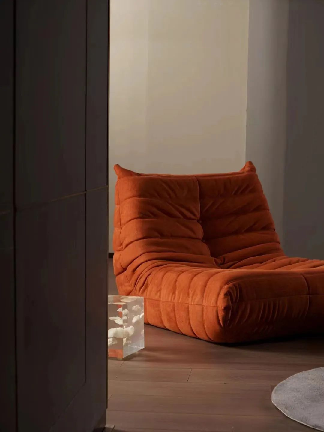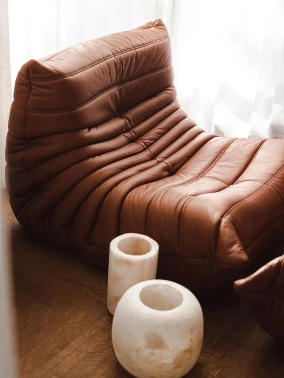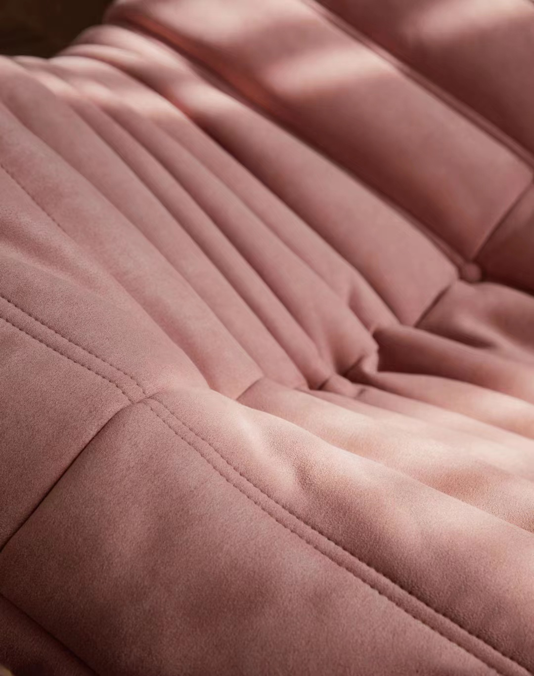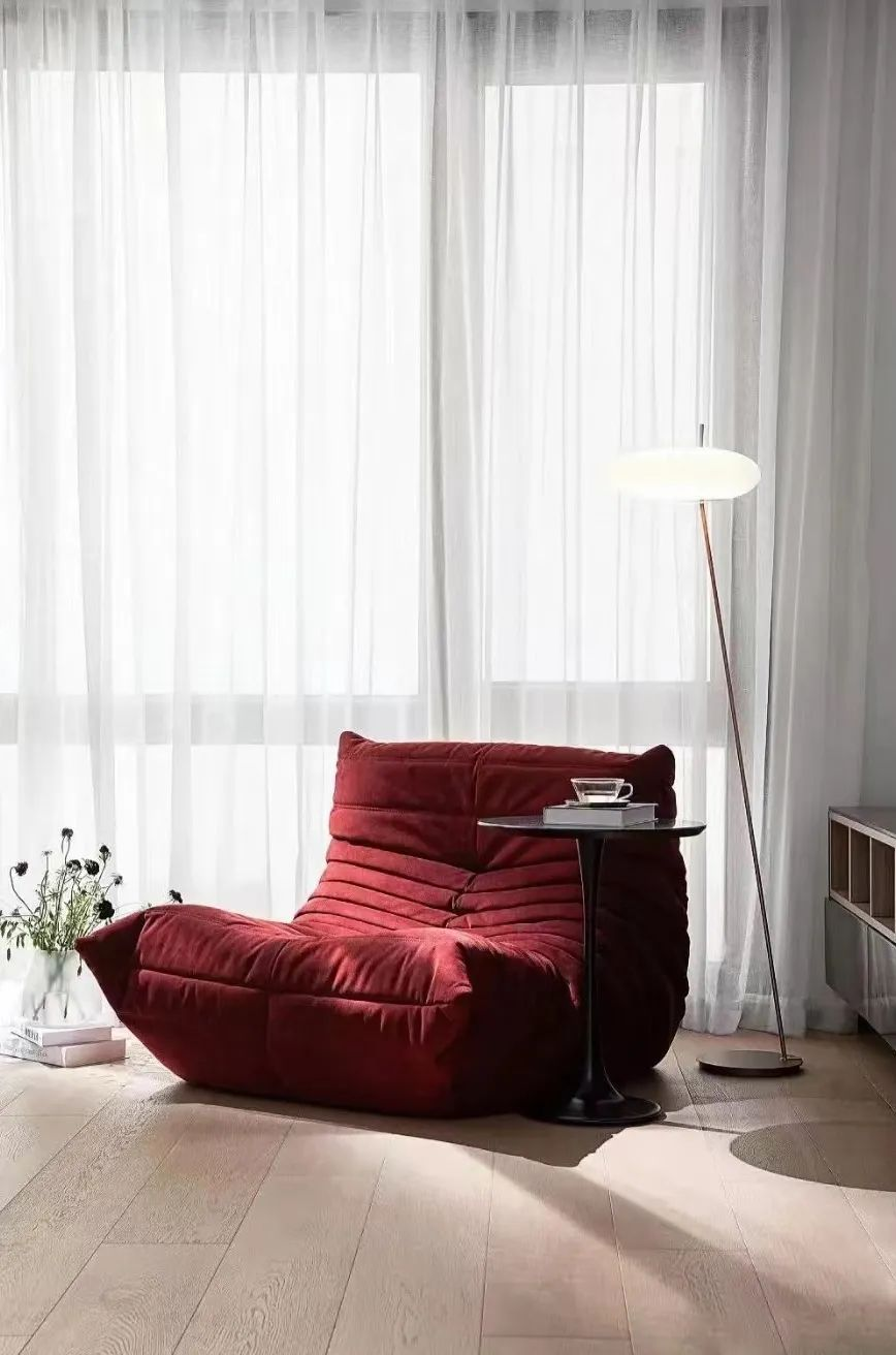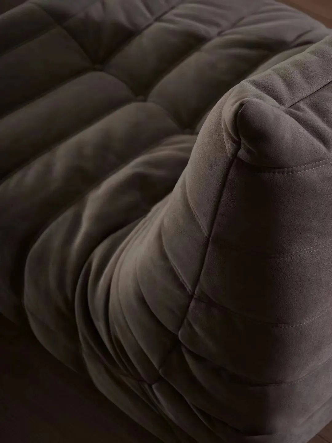 Togo沙发的造型比起普通沙发要扁得多,四只棱角尖尖,沙发表面上满是一层层的褶子,靠背上的曲线像是被随意弯曲过来的,自带一种可爱慵懒的气质,而且躺平体验特别舒适,“葛优瘫”必备。