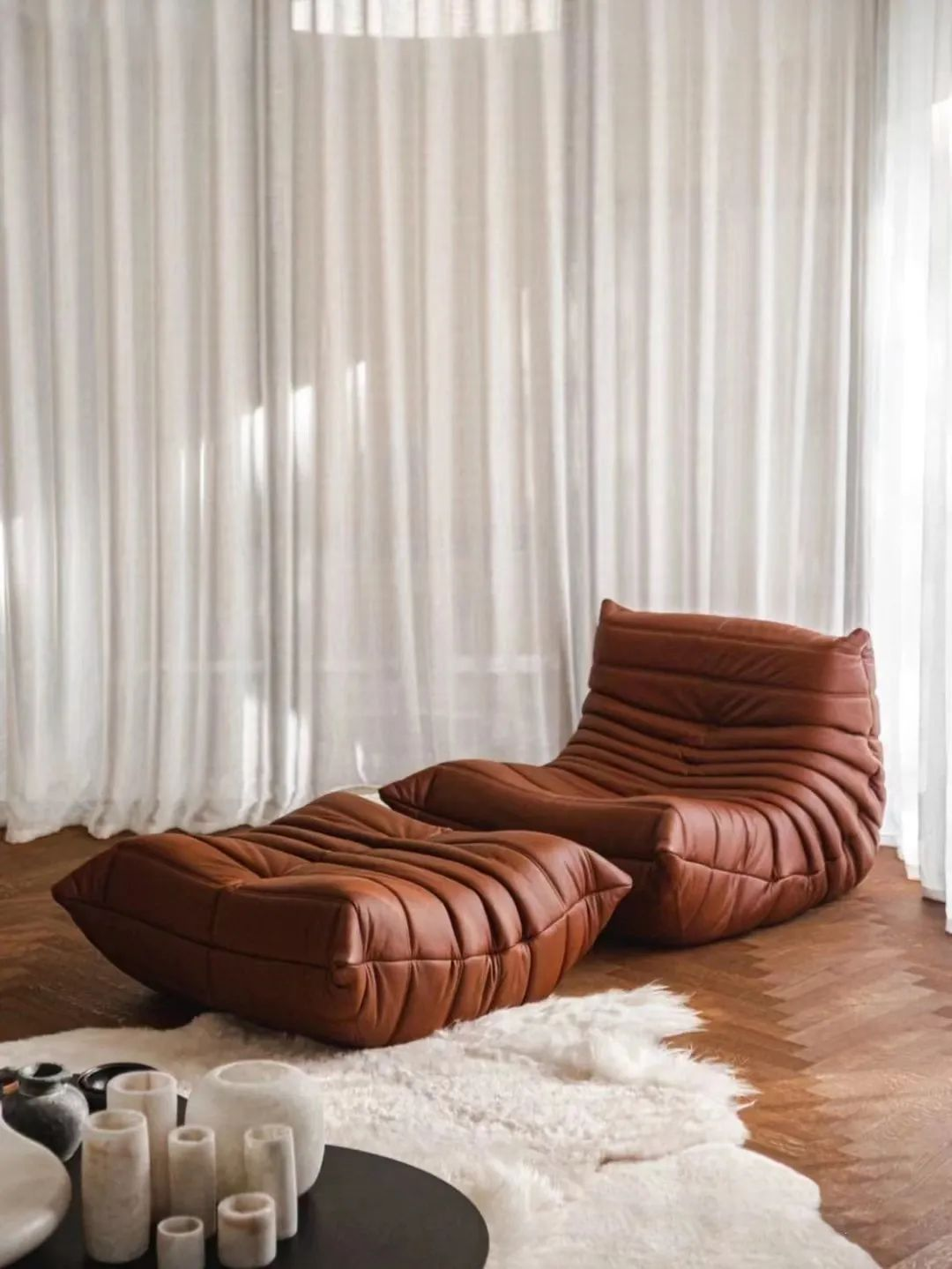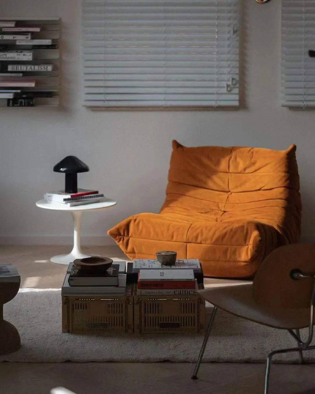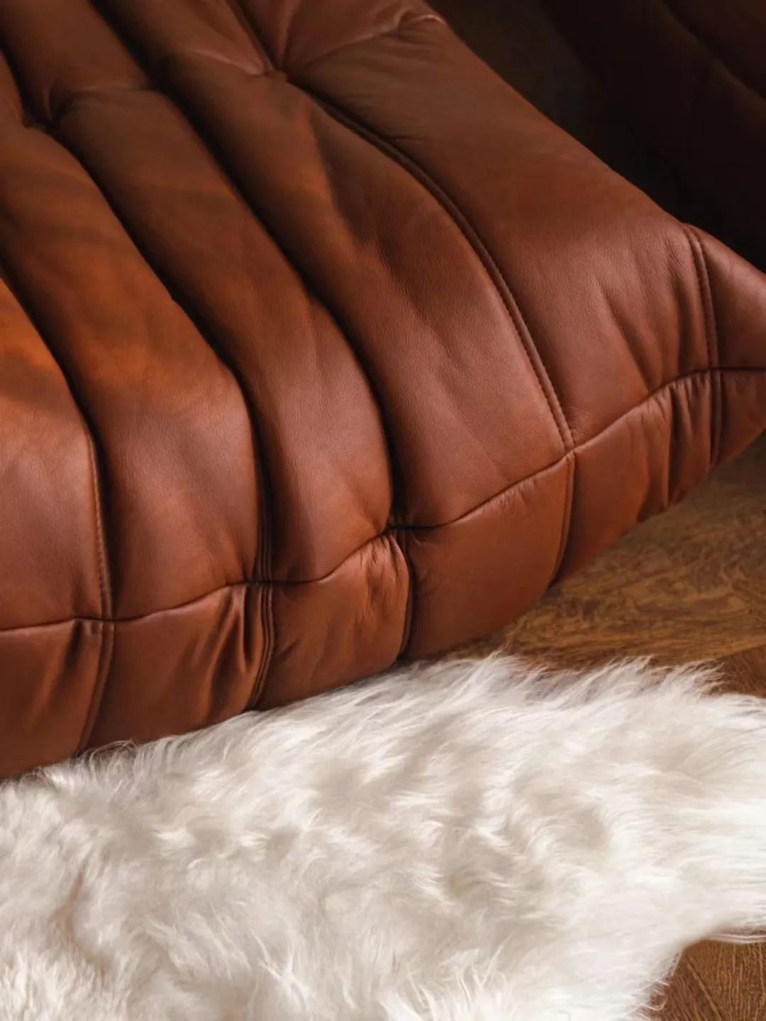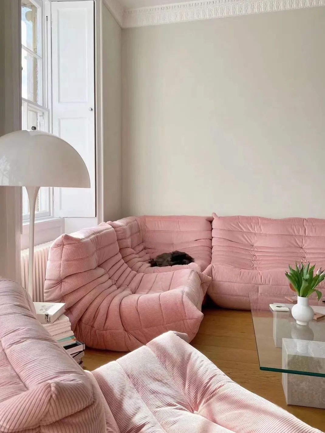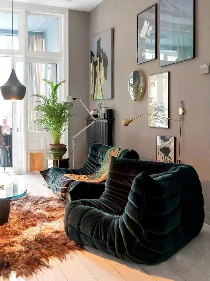 Togo沙发的造型比起普通沙发要扁得多,四只棱角尖尖,沙发表面上满是一层层的褶子,靠背上的曲线像是被随意弯曲过来的,自带一种可爱慵懒的气质,而且躺平体验特别舒适,“葛优瘫”必备。