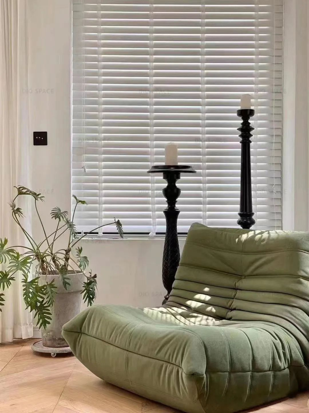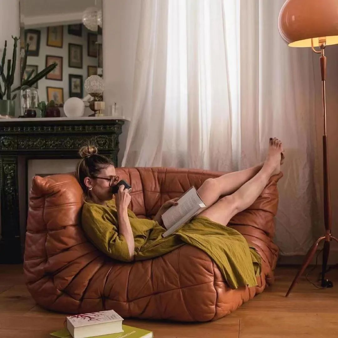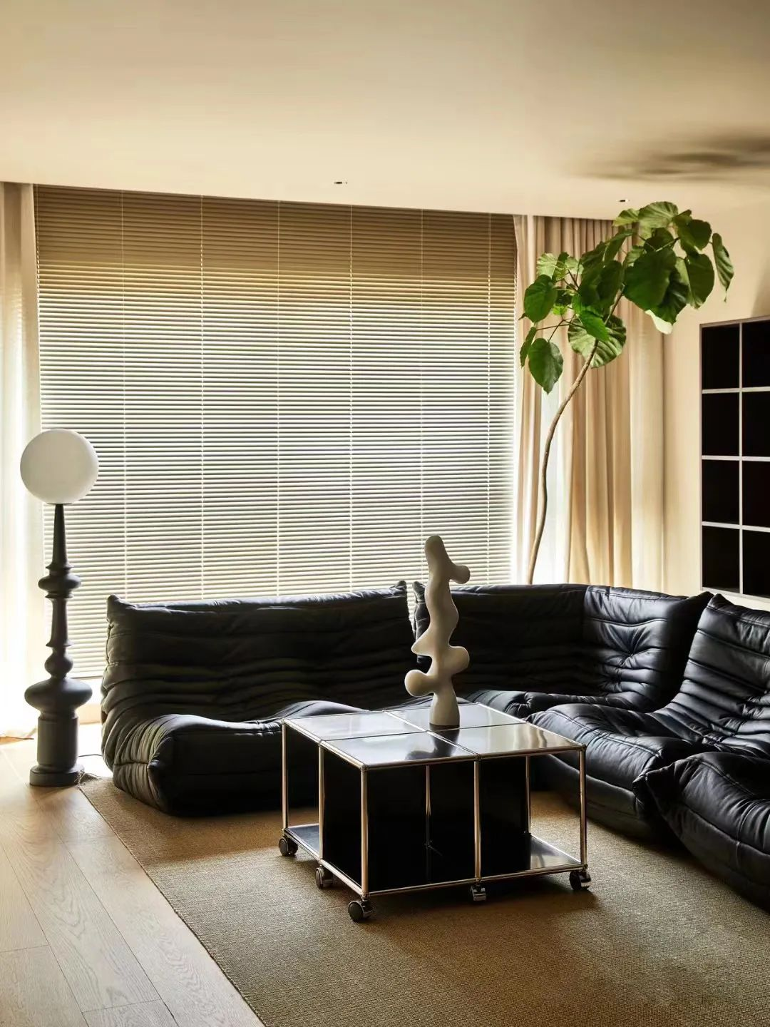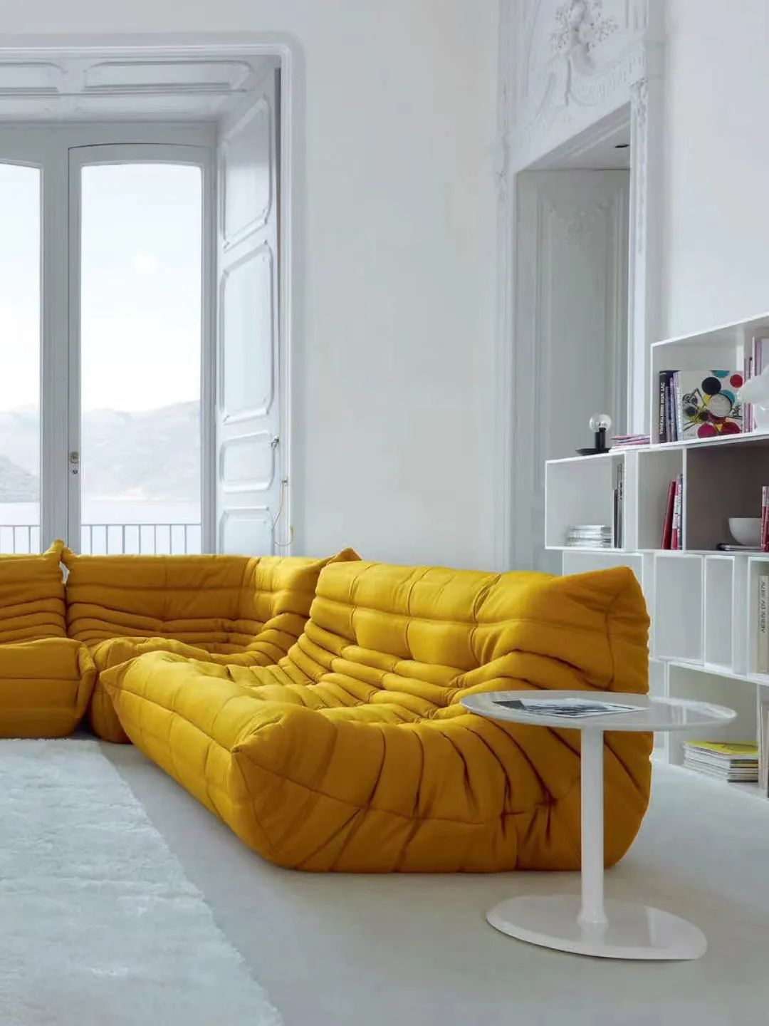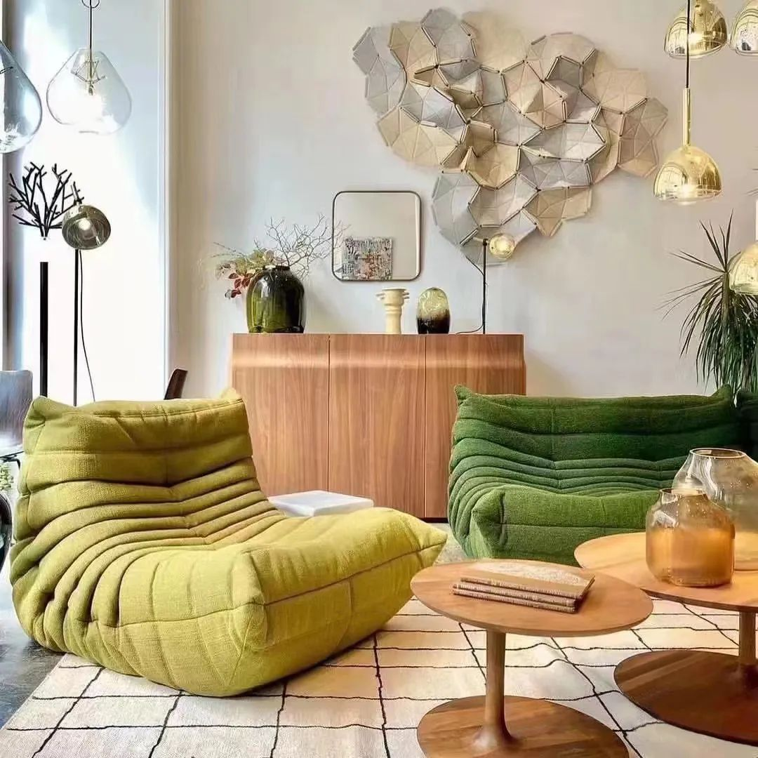 Togo沙发的造型比起普通沙发要扁得多,四只棱角尖尖,沙发表面上满是一层层的褶子,靠背上的曲线像是被随意弯曲过来的,自带一种可爱慵懒的气质,而且躺平体验特别舒适,“葛优瘫”必备。