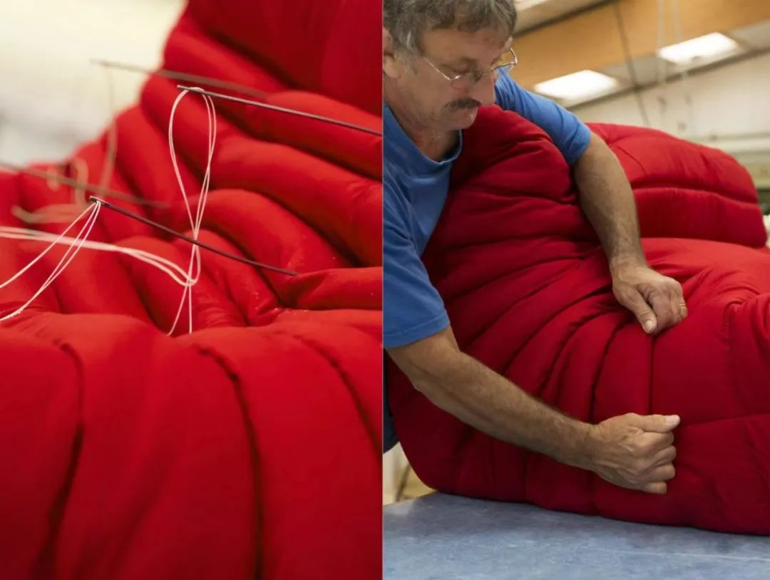Togo沙发这些看起来很随意的褶子制作起来是非常耗时,它需要高强度的手工劳作,每一个Togo沙发都是要ligne roset通过机器和手工缝纫共同完成。对于一组大型沙发,整个填充过程很长,织物表面的打褶缝制需要不间断工作4个小时,而皮革的则需要至少6个小时。