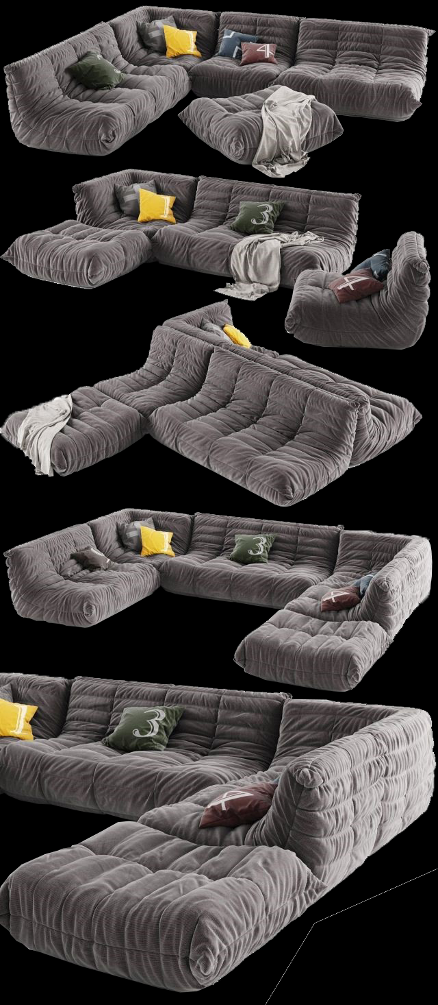 ligne roset在Togo上采用了最符合人体工程学的设计,由6种不同密度和28种不同造型的泡棉构成,除去了金属、实木或者塑料框架,重量轻、占地小的同时还拥有舒适的坐感,真正给予了沙发柔软和舒适性。