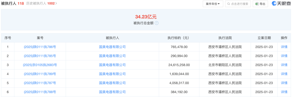 截至天眼查最新统计,国美电器现存118条被执行人信息,累计被执行金额高达34.23亿元。另外,国美电器还存在9限制消费令、95条失信被执行人(老赖)及74条终本案件信息。