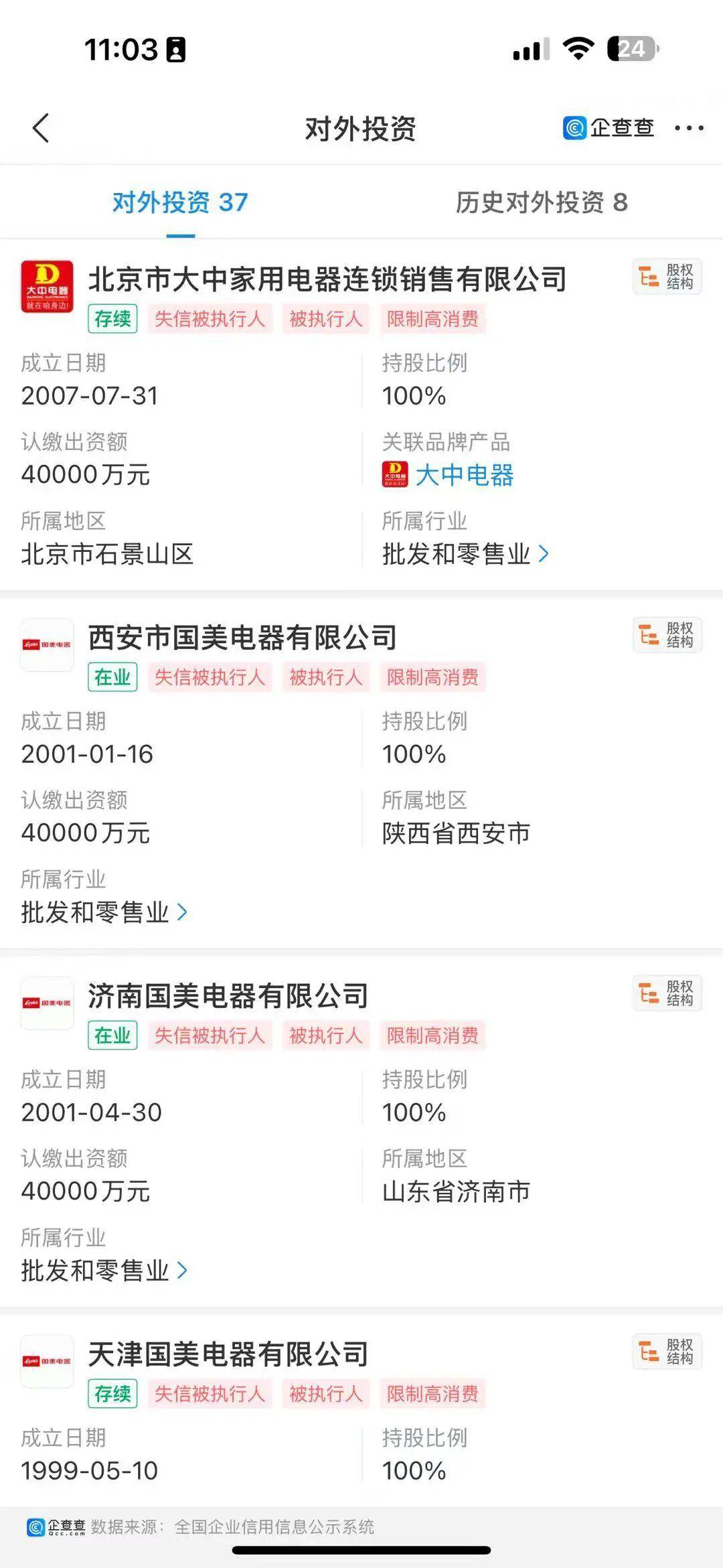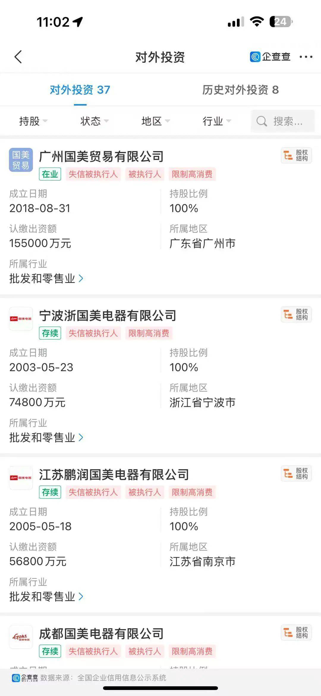 另外,还有几个已经破产的子公司,包括温州鹏润国美电器有限公司、江苏镇江国美电器有限公司、南通国美电器有限公司、厦门国美电器有限公司、上海国美电器有限公司等。