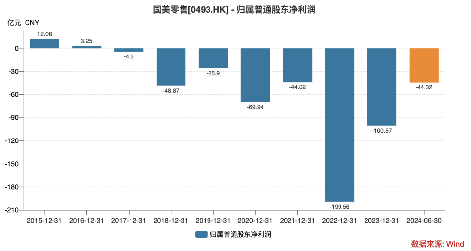 Wind数据显示,截至2024年6月30日,国美零售总负债为413.40亿元,超出其总资产的金额达到134亿元,资产负债率高达148.02%。