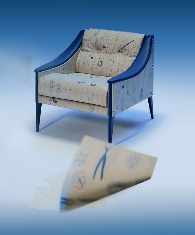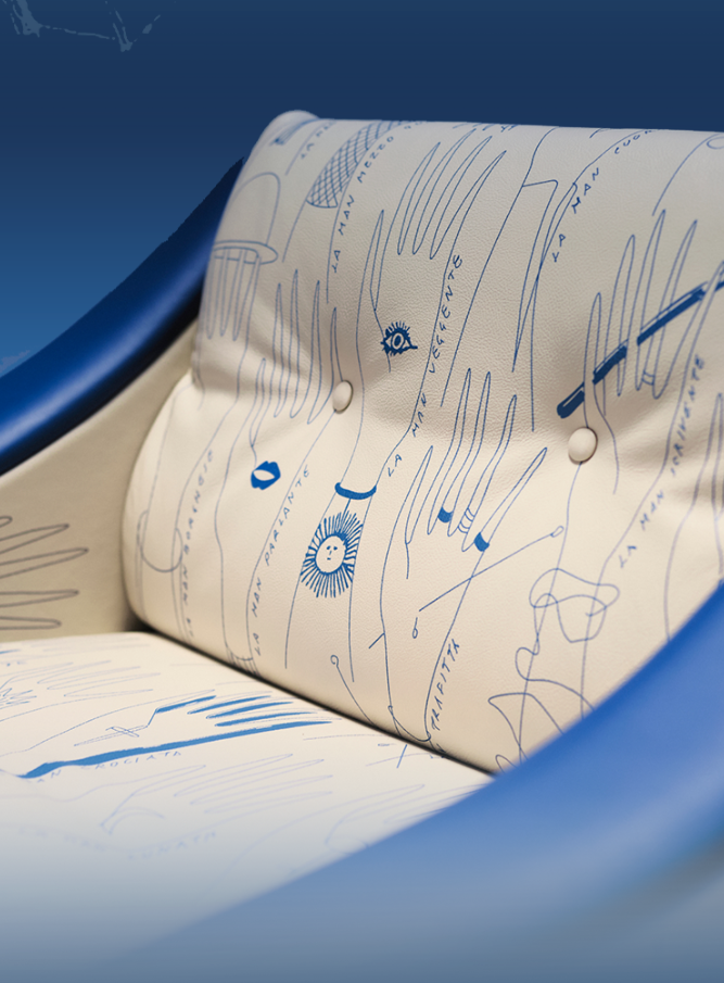 六十周年全球限量款新作Dezza扶手椅,由淡雅的奶油色与鸢尾紫色调交织而成,恍若重现了Gio Ponti为索伦托Parco dei Principi酒店打造的空灵愉悦的室内设计。其中,标志性的白色与蓝色马约利卡瓷砖地砖图案,依然闪耀着大师的艺术光辉。最为点睛之笔在于椅面上,严苛甄选的Gio Ponti未公开手稿插图。