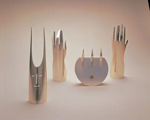 此外,Gio Ponti创作的形态各异的“手”,既是对艺术家与陶艺家精湛手工技艺的致敬,正是这些技艺赋予了材料鲜活生命力;也是人性的简约象征,这一点在《lo Stile》杂志的封面设计中得以充分体现。最后,“手”的元素还为创作增添了趣味性,如用金属片切割成“手”的轮廓,或是Sabattini以“六指手”造型带来的诙谐趣味。