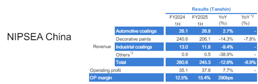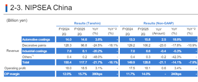 从具体业务线来看:第二季度,在汽车涂料领域,尽管日系车企在中国市场的生产表现疲软,但在中国整体汽车产量同比增长9%的有利环境下,通过加强对本土汽车制造商的业务拓展,该业务仍实现了收入增长。通用涂料方面则面临较大压力:TUC业务因公司主动提高授信管理标准导致销量下降,收入减少11%;TUB业务受房地产行业深度调整影响,收入降幅达19%。工业涂料业务同样表现不佳,普通工业涂料及粉末涂料需求疲软导致收入下滑。