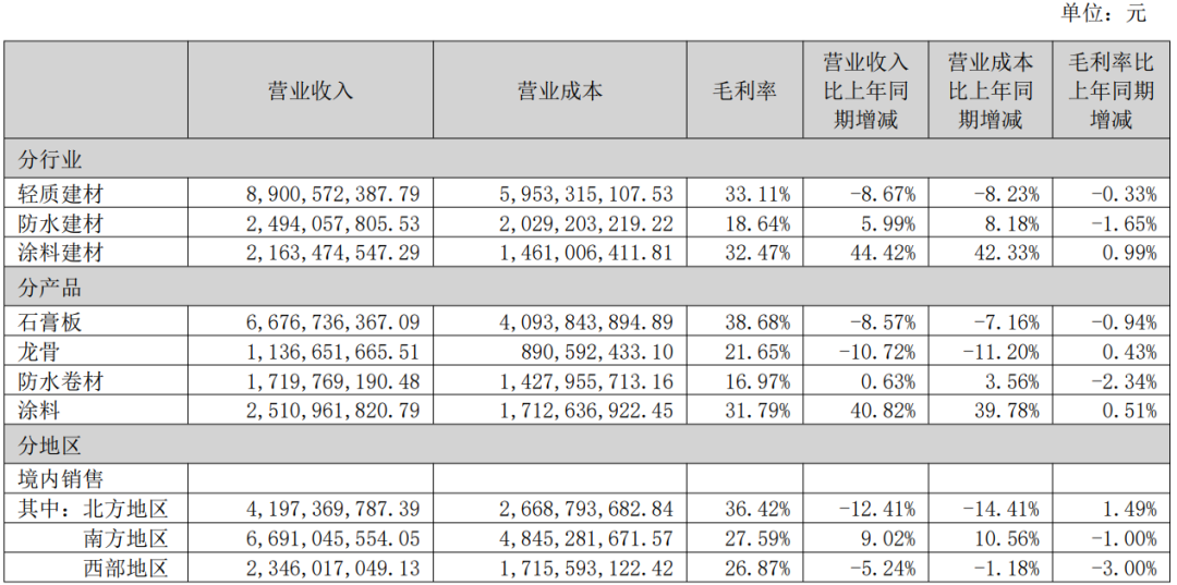 分产品来看,石膏板营收66.77亿元,同比减少8.57%;龙骨营收11.37亿元,同比减少10.72%;防水卷材营收17.20亿元,同比增长0.63%;防水工程营收2.05亿元,同比减少1.76%;涂料营收25.11亿元(其中:分部1营收185.34万元,分部2营收4.661亿元,分部3营收20.43亿元),同比增长40.82%;其他营收13.10亿元,同比增减少0.87%。境外销收入3.237亿元,同比增长68.78%。