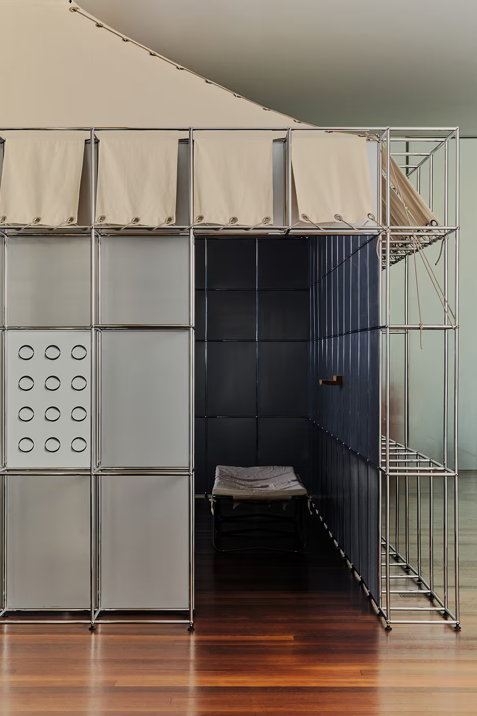 Daye凭借其在酒店、零售与住宅领域的丰富设计经验,将展厅空间转化为一个“游牧城市胶囊”,邀请访客沉浸于她所构建的、融合漂泊感与同理心的生活场景中。装置以“极简庇护所”与“混合建筑”为概念核心,将USM模块化系统从家具范畴拓展至建筑材料领域。