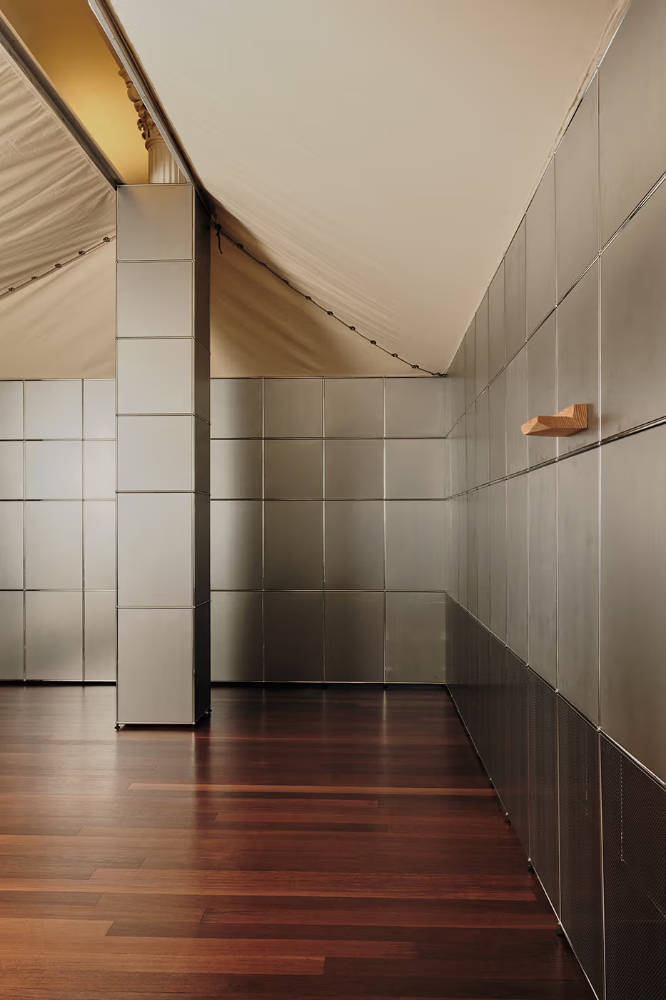 空间中,帆布帐篷屋顶与原始钢材、玻璃及镀铬屏风共同构筑出具有保护性的界面与分隔结构。每个组件均配以取自Catskills山区回收木梁的磁吸手工木饰,并点缀以Daye的个人物品,使整体装置深深植根于其所处的自然与文化环境。