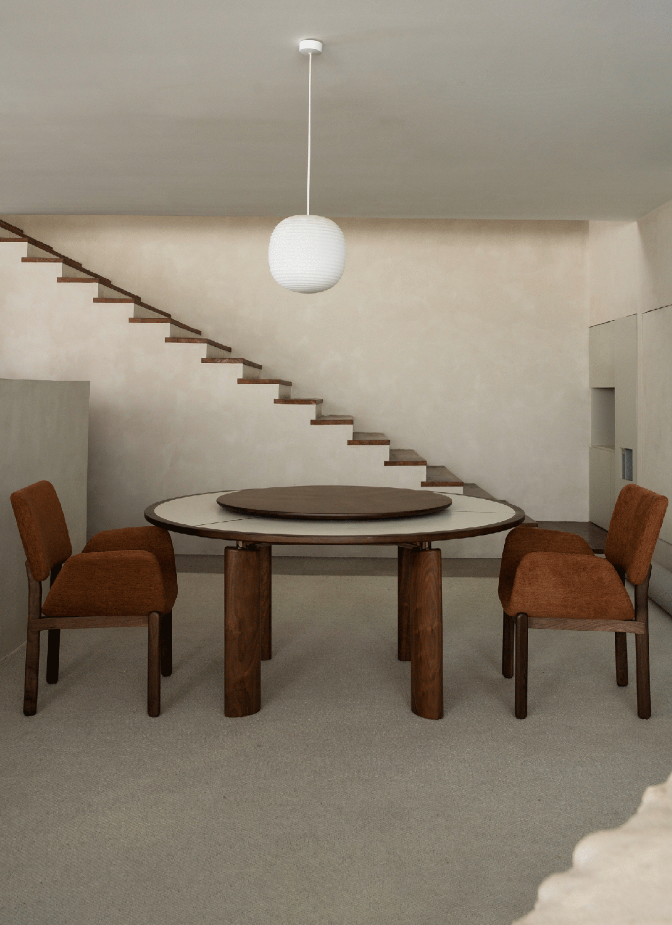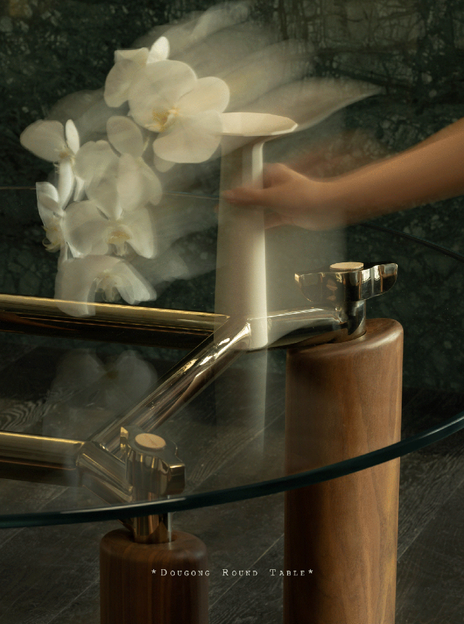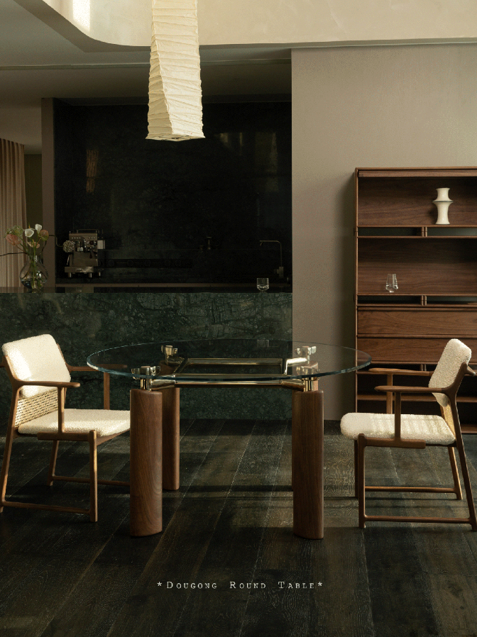 斗拱圆桌将传统建筑智慧融入现代设计,桌腿结构灵感源自中国古建斗拱,以精确的力学分布实现稳固支撑。桌面选用加厚钢化玻璃,如海面般清澈通透,与实木桌腿形成轻盈与厚重的巧妙对比。