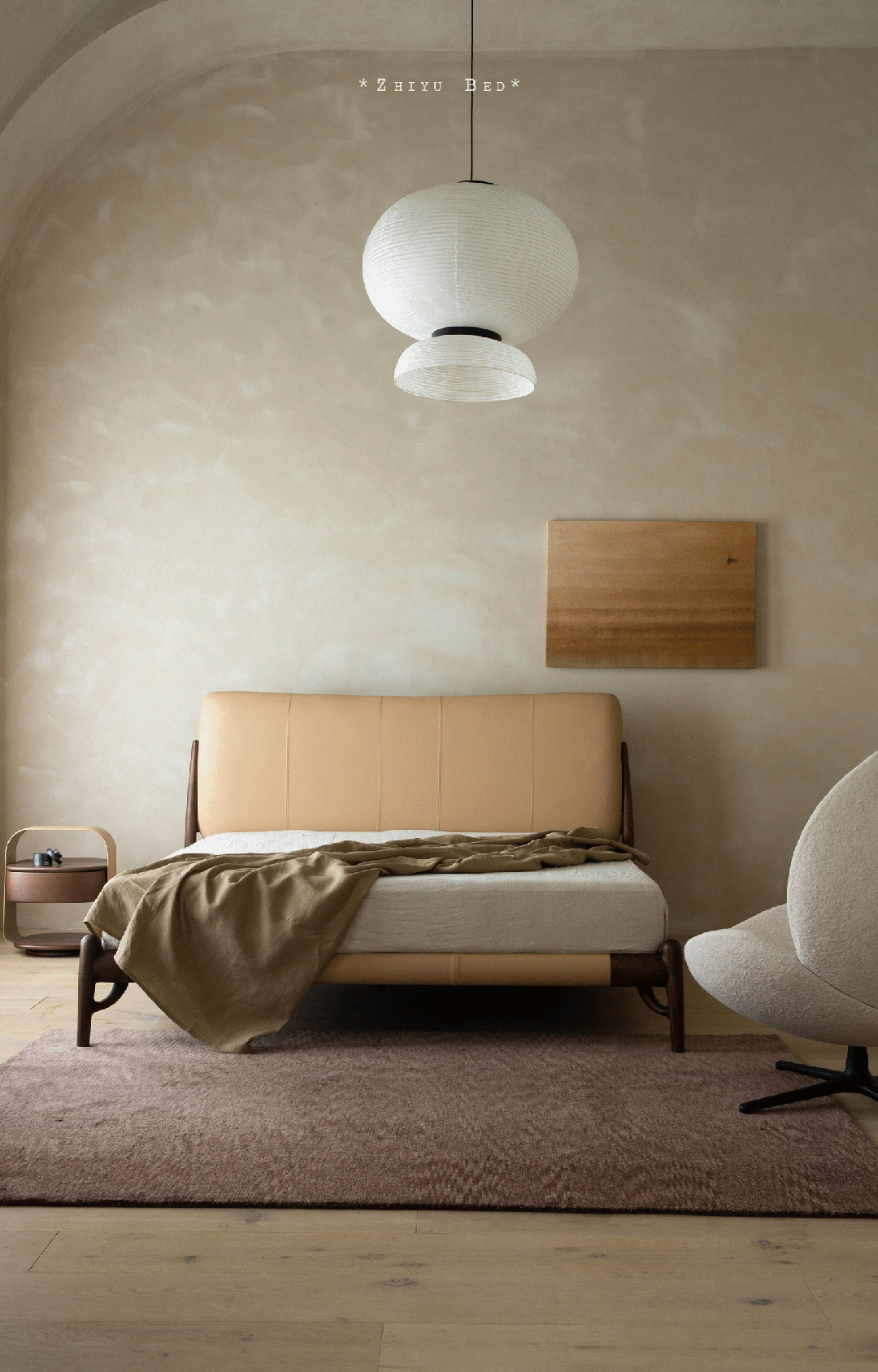 在卧房区域,枝语床以自然的枝桠形态为设计语言,床头靠包采用整块实木雕刻成型,线条流畅而富有生命力。床体结构经过特别加固,即使在翻身时也能保持静音,确保睡眠的安宁与质量。