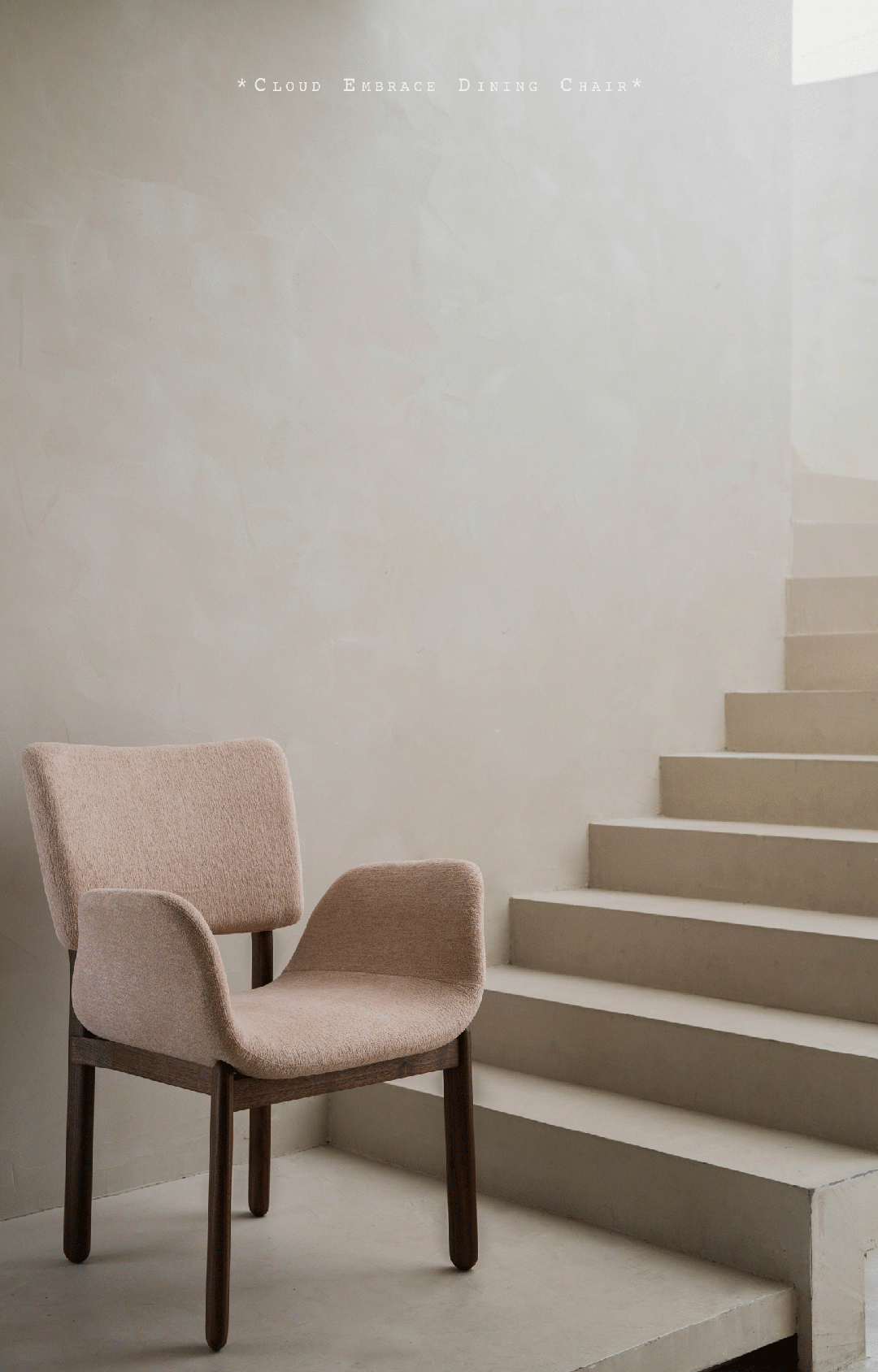 餐厨空间的拢云环抱餐椅则展现了梵几对人体工学的深入理解。椅背两侧如蝶翼般微微展开的弧度,为背部提供恰到好处的侧向支撑。坐垫填充高弹性羽绒,久坐不易变形,让用餐时光更加舒适惬意。