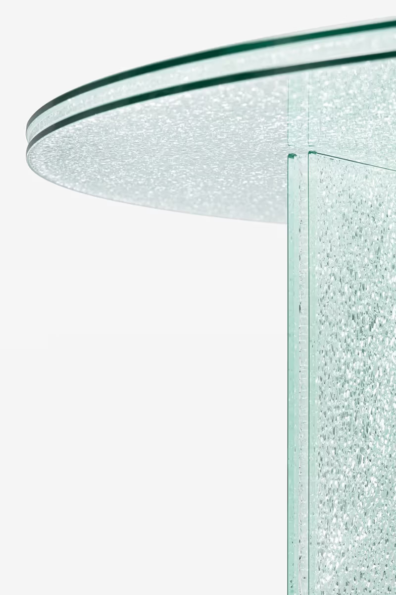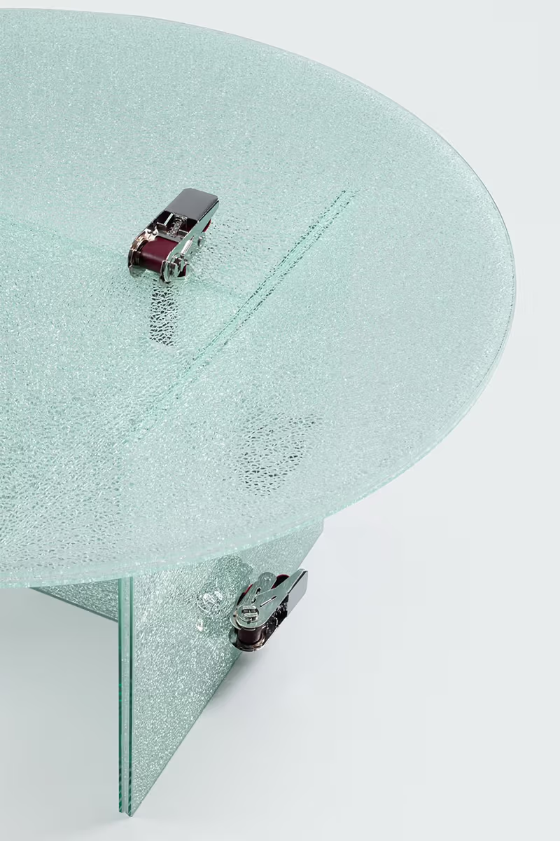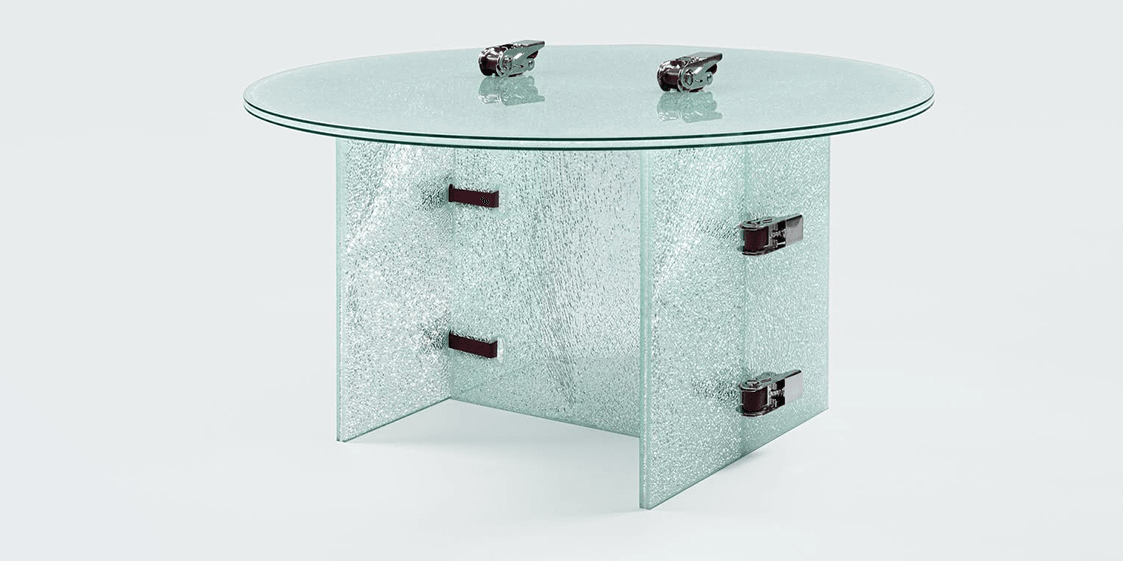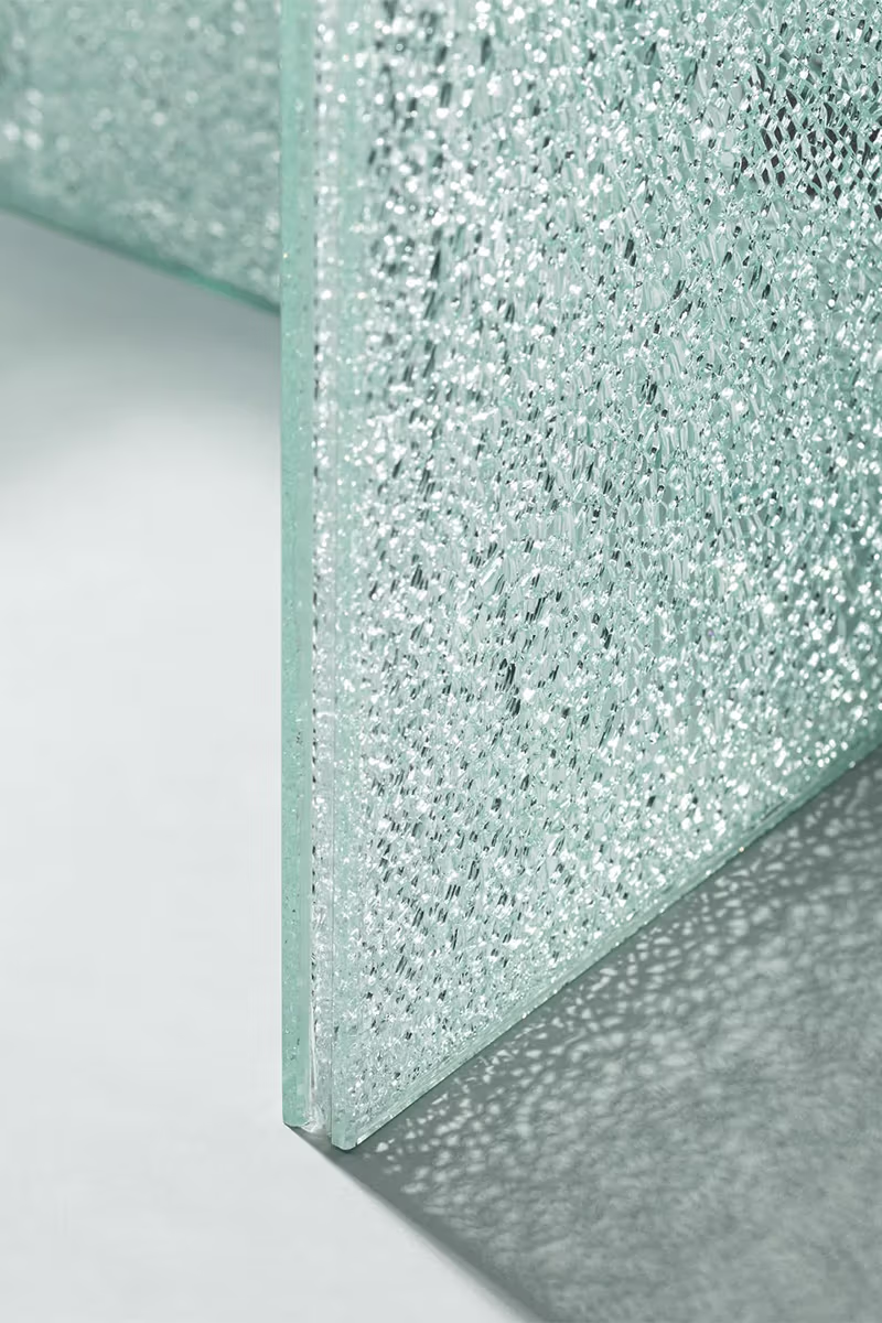该桌子的结构由三层夹层钢化玻璃组成,其中中间一层被特意击碎。由于碎裂层被夹在另外两片完整玻璃之间,桌面依然保持平滑与安全,同时呈现出独特的光影纹理——当光线穿过破碎的内层时,会产生折射、弯曲与散射,形成闪烁的失真感与细腻的表面肌理,这是普通平整玻璃无法达到的效果。