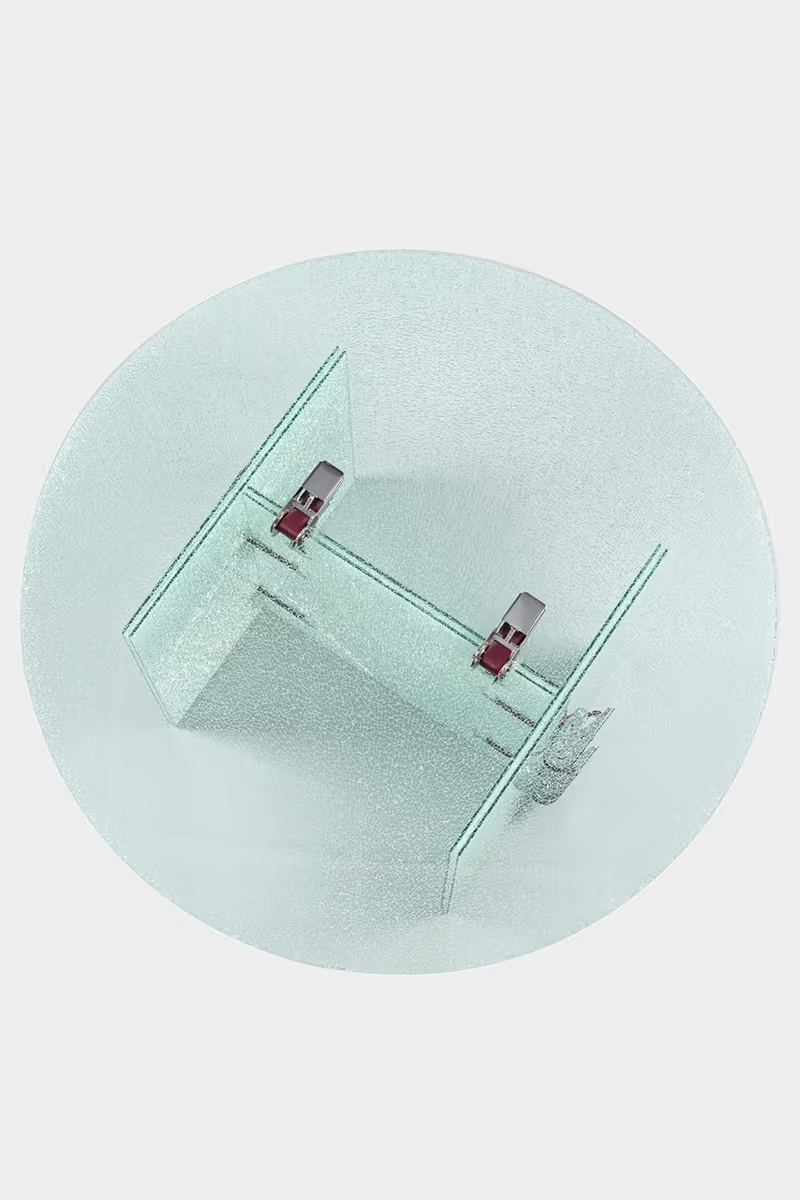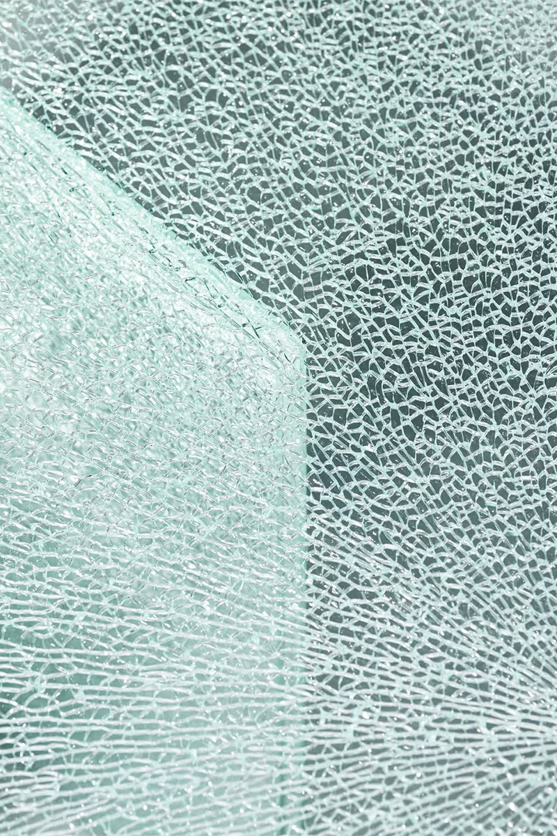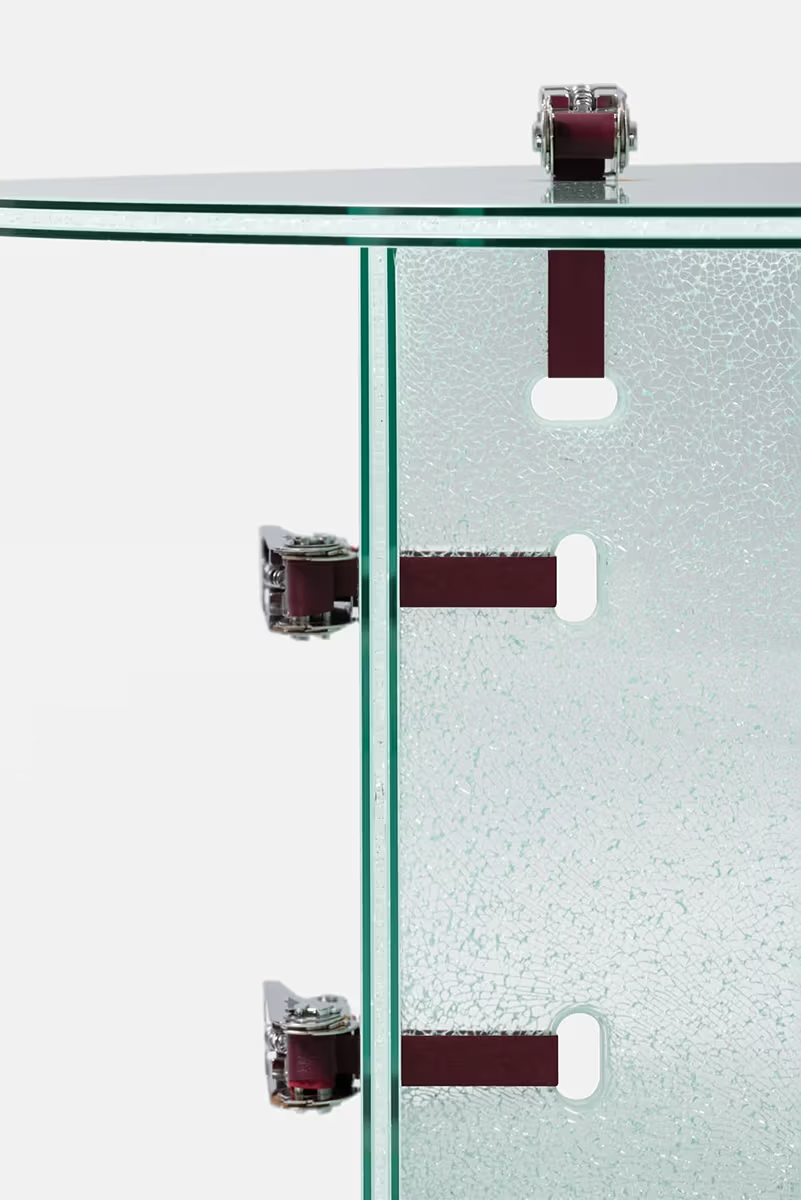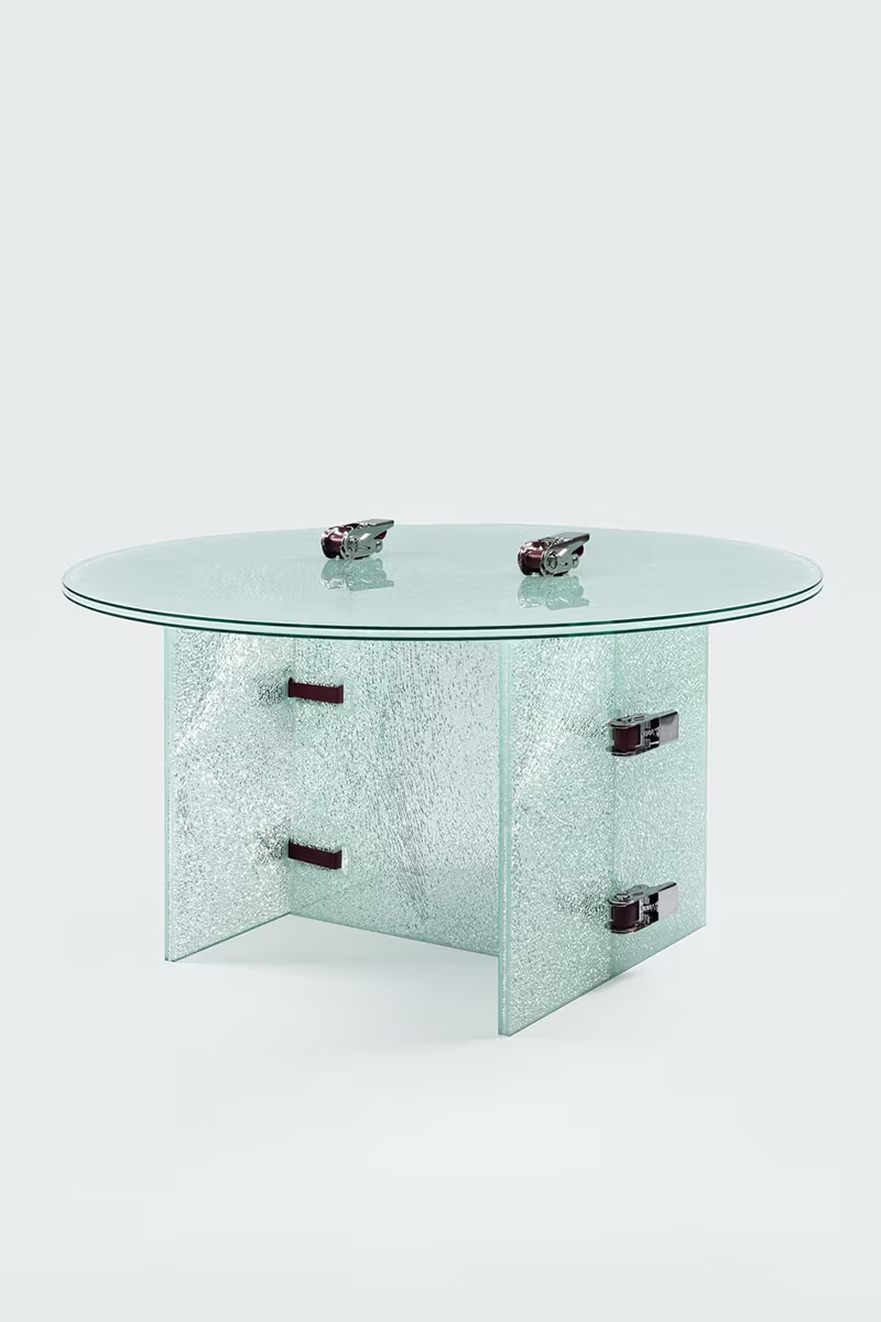 该桌子的结构由三层夹层钢化玻璃组成,其中中间一层被特意击碎。由于碎裂层被夹在另外两片完整玻璃之间,桌面依然保持平滑与安全,同时呈现出独特的光影纹理——当光线穿过破碎的内层时,会产生折射、弯曲与散射,形成闪烁的失真感与细腻的表面肌理,这是普通平整玻璃无法达到的效果。
