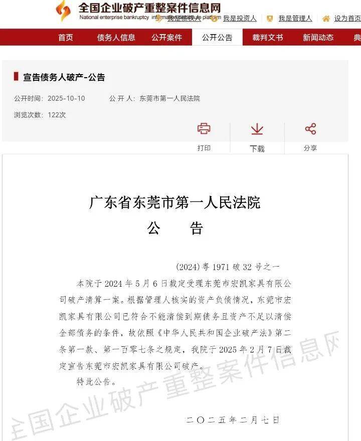 10月10日,全国企业破产重整案件信息网发布公告,宣告东莞市宏凯家具有限公司正式破产。这家经营长达21年的家具制造企业,最终因资不抵债而退出市场。