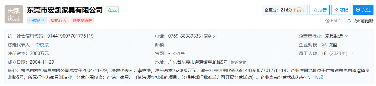 然而,就是这家曾经致力于打造精品家具的企业,在激烈的市场竞争中逐渐陷入困境。企业状态记录显示,破产前宏凯家具已被列为“被执行人”并受到“限制高消费”的强制措施,反映出其早已出现严重的财务危机。