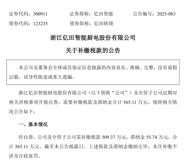 10月13日晚间,集成灶行业知名企业亿田智能发布公告,宣布公司及全资子公司通过自查需补缴税款及滞纳金合计565.11万元,其中税款509.37万元,滞纳金55.74万元。公司强调,此次补缴不涉及行政处罚及前期财务数据追溯调整,相关金额将计入2025年当期损益。