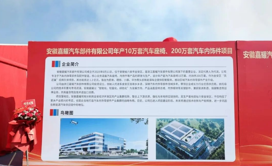 据介绍,安徽嘉耀汽车部件有限公司成立于2025年6月11日,注册资本1000万元,位于安徽省六安市金安区,是浙江嘉耀汽车部件有限公司在安徽布局的重要子公司。该公司法定代表人代波作为六安市金安区翁墩乡乡贤,此次投资也被视为金安区“凤还巢”招商引资工程的标志性成果。公司专注于汽车内饰零部件及配件智造,核心业务涵盖汽车座椅、内饰件等产品的研发与生产,旨在为蔚来、理想、小鹏、华为等头部新能源车企提供配套服务。