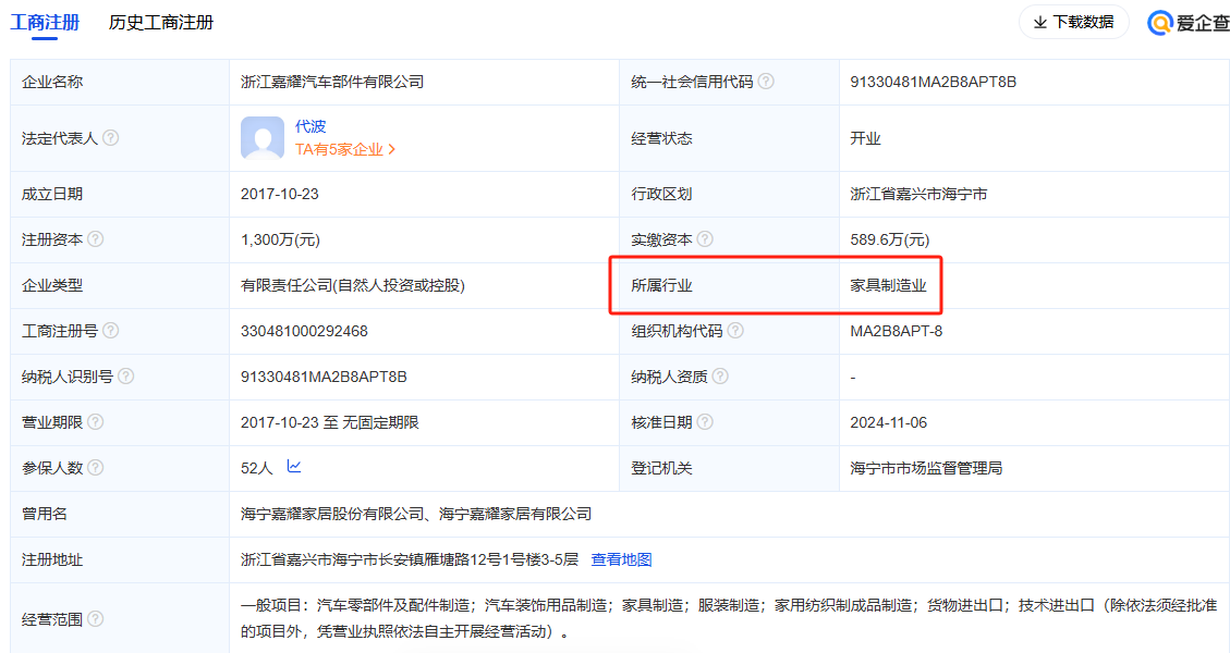 此次跨界背后是母公司深刻的战略转型。浙江嘉耀汽车部件有限公司前身为海宁嘉耀家居股份有限公司,成立于2017年10月23日,最初从事家具制造业务。2024年10月,公司完成重大战略调整,从“海宁嘉耀家居股份有限公司”正式更名为“浙江嘉耀汽车部件有限公司”,经营范围也从家具制造全面转向汽车零部件及配件制造。