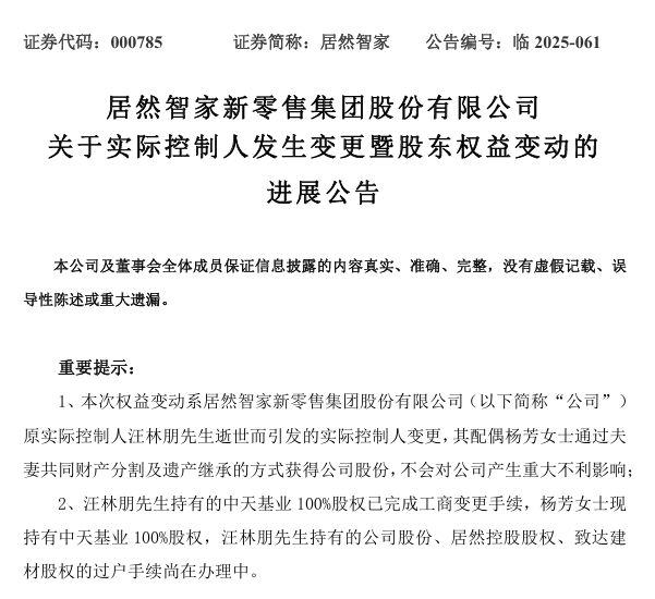 居然智家于10月13日发布公告,宣布公司实际控制人正式变更为创始人汪林朋的配偶杨芳。这一重大变动源于原实际控制人汪林朋的逝世,杨芳通过夫妻共同财产分割及遗产继承方式获得公司股份,目前合计控制27.36亿股,占公司总股本的43.93%,成为公司新的实际控制人。