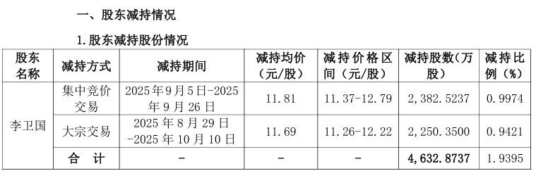 根据公告,李卫国在2025年9月22日至10月10日期间,通过大宗交易和集中竞价方式减持624.35万股,占总股本的0.2614%。本次权益变动后,李卫国及其一致行动人李兴国的合计持股比例由21%降至20.7386%。