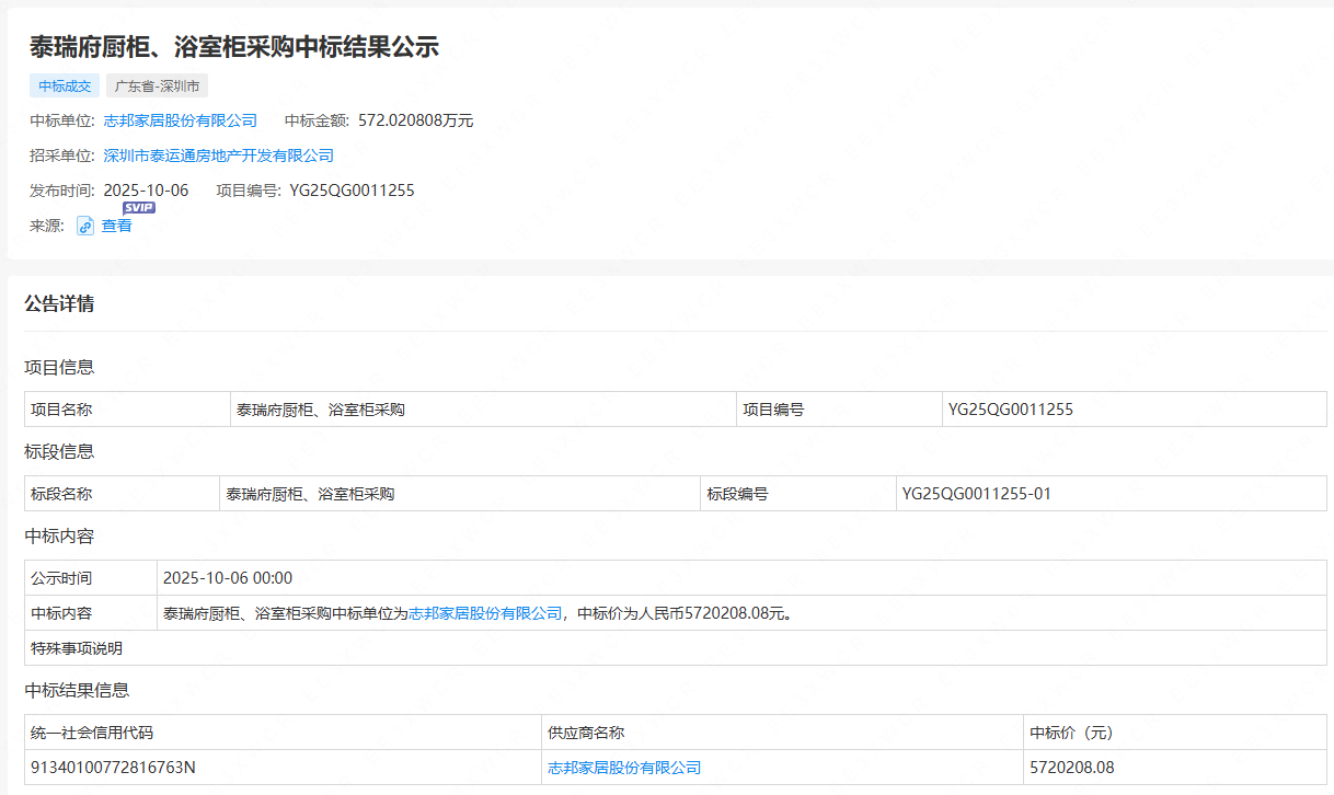 近日,志邦家居股份有限公司成功中标深圳市泰运通房地产开发有限公司的“泰瑞府厨柜、浴室柜采购项目”,中标金额为572.02万元。该项目作为总建筑面积超过15万平方米的大型综合社区建设的重要组成部分,其配套产品的采购与交付备受市场关注。