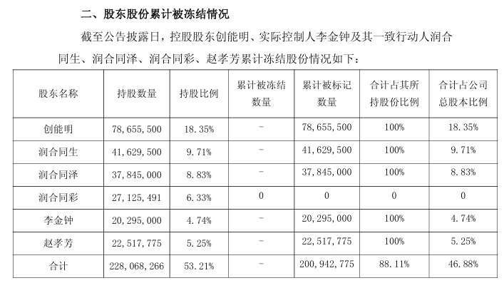 截至上述公告披露日,创能明、李金钟及其一致行动人累计冻结股份占其所持股份比例88.11%,合计占公司总股本比例46.88%。