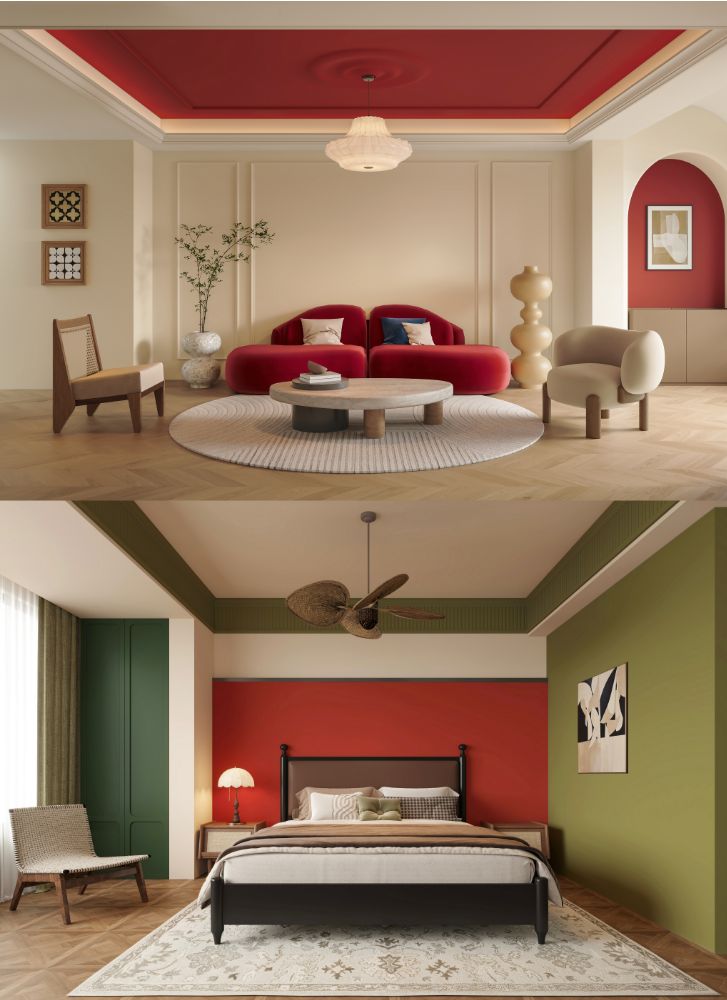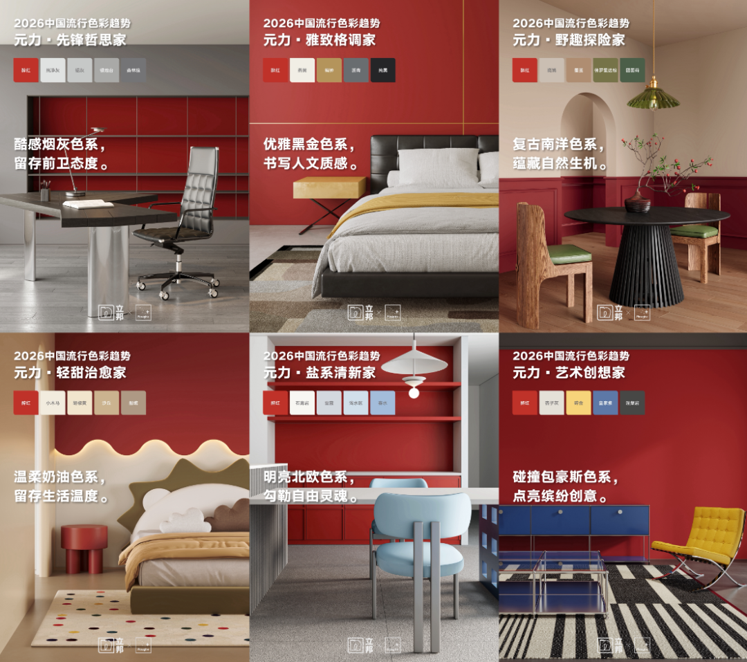 围绕主推色“元力红”,立邦推出六大家居风格色盘,精准覆盖不同人群的居住需求。这些色盘设计并非简单的色彩搭配,而是立邦对“以人为本”居住需求的深度回应——让每个家庭都能通过色彩定制符合自身生活习惯与情绪需求的居住空间。