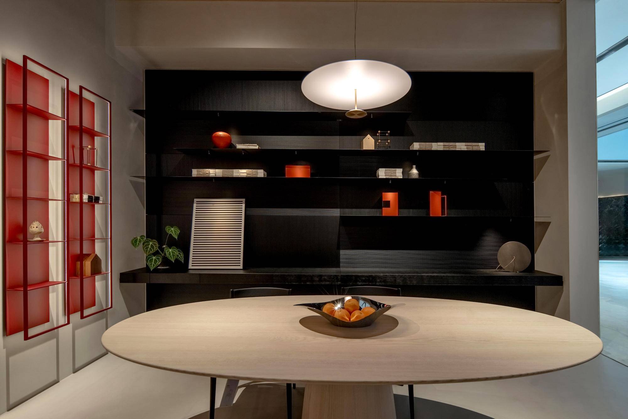 Carlo Tamborini 设计的两款 Gap 悬挂式书架,采用精致的中国红金属饰面,以其夺目的魅力成为店内的亮点。