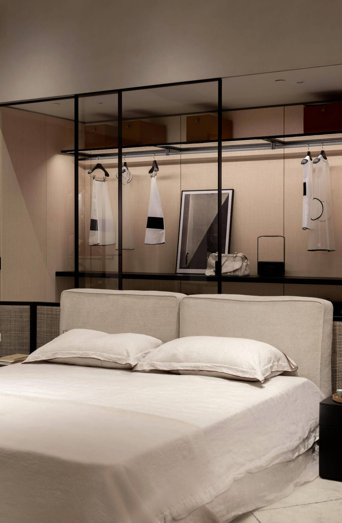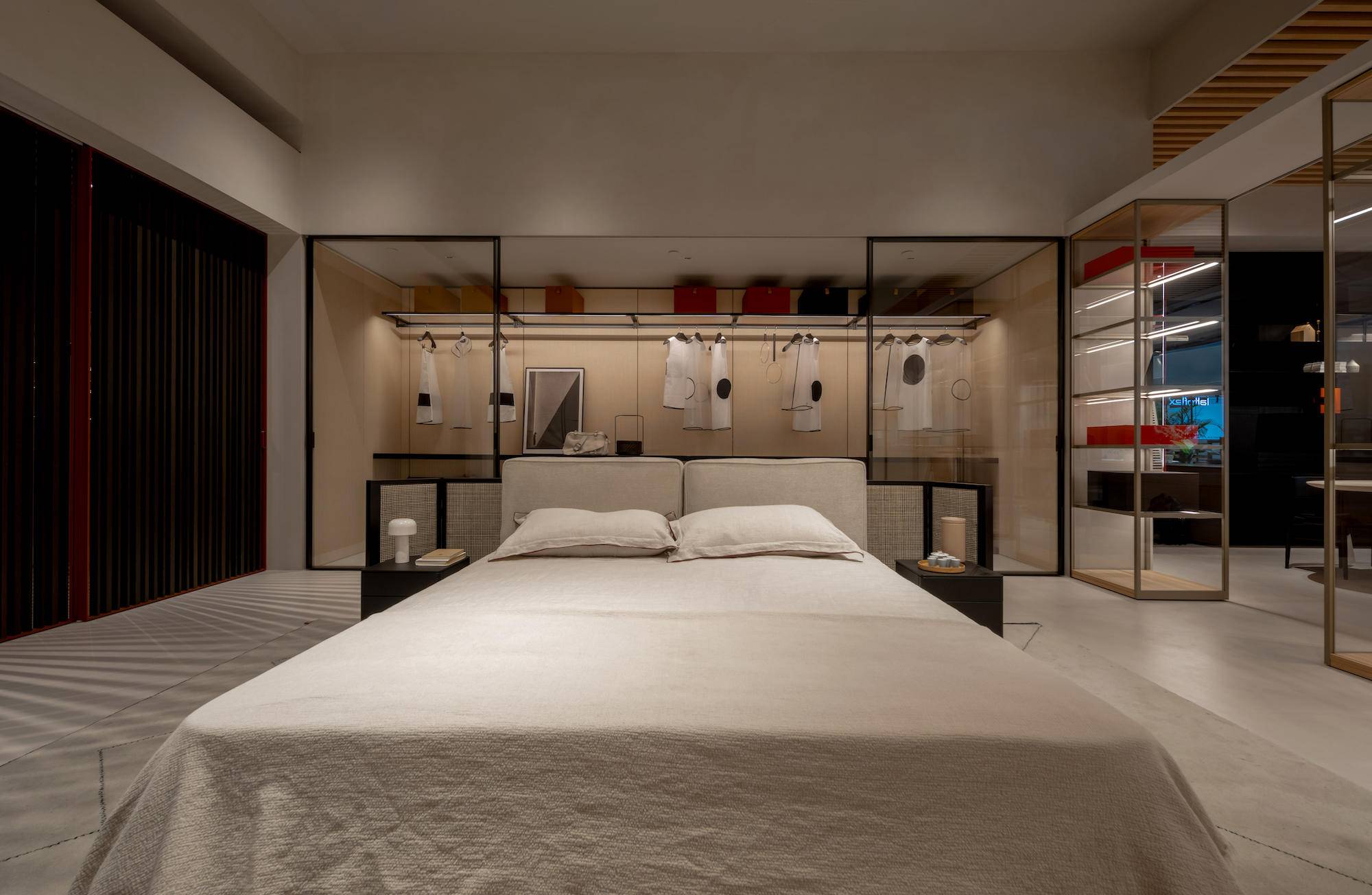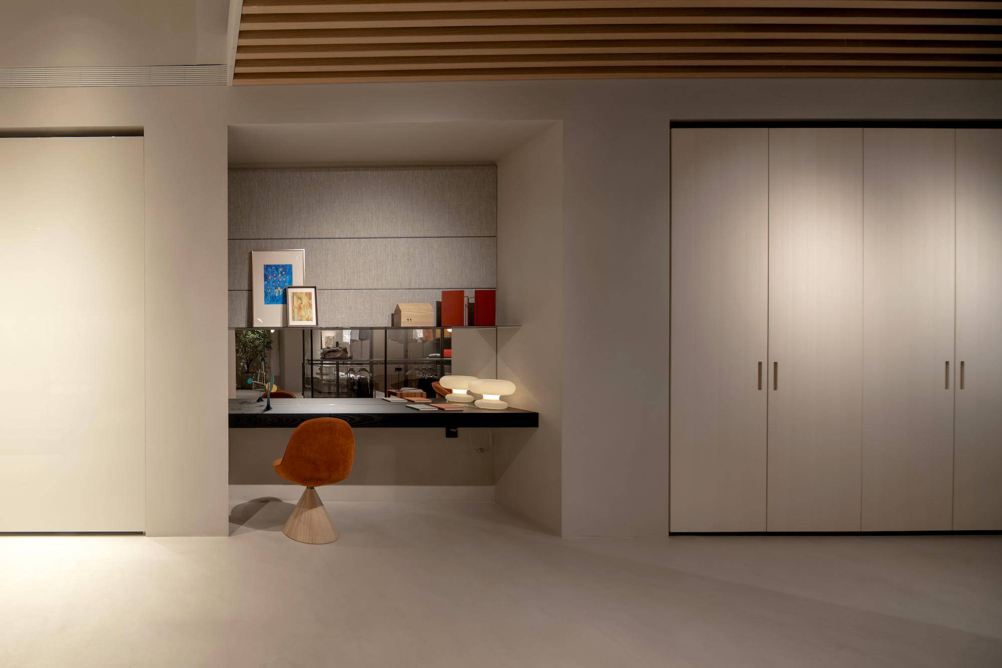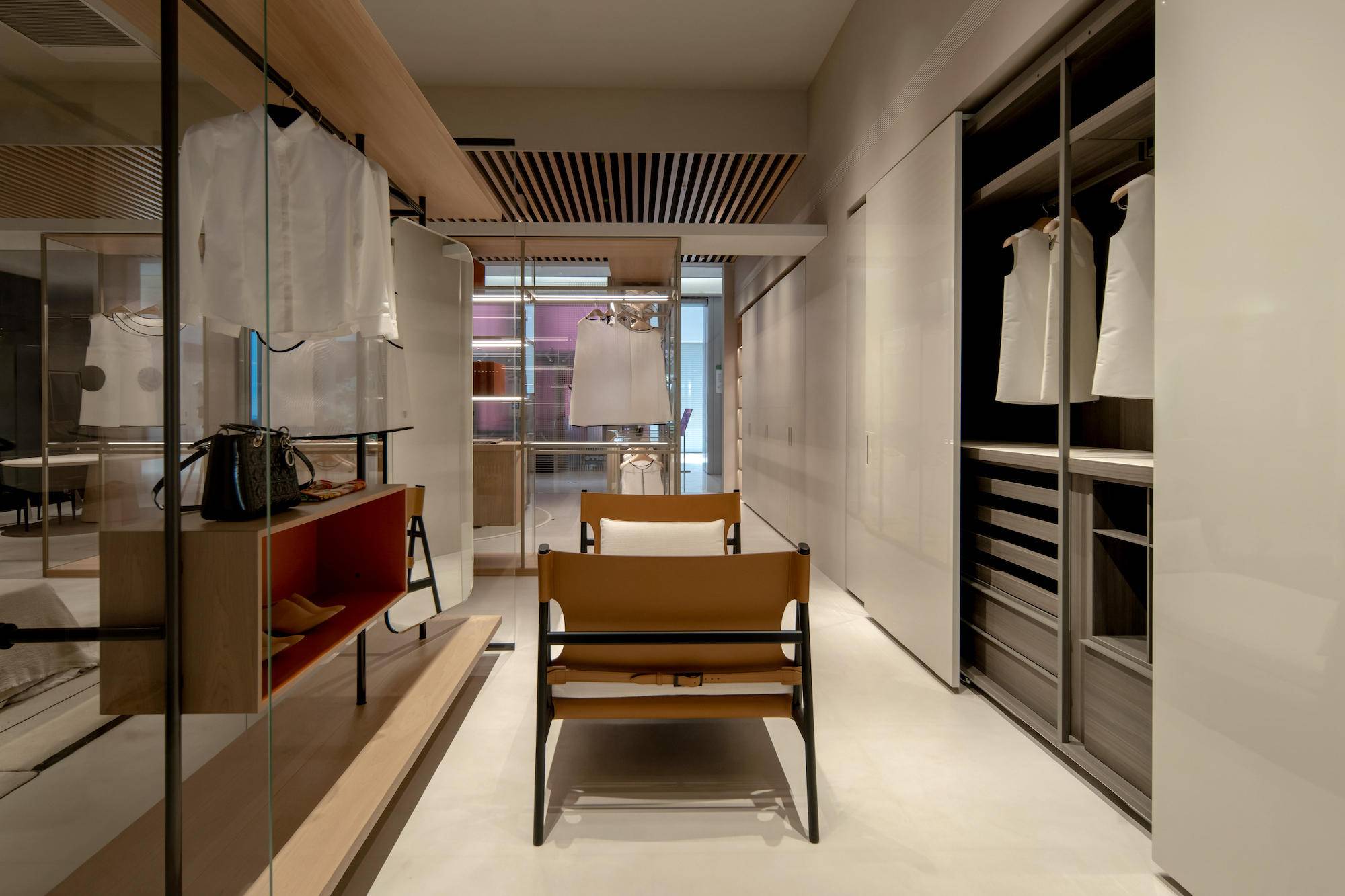 Piero Lissoni 设计的 Boutique Mast 系统用于布置空间并引导人们进入一个小型的休闲区,该系统配有白色樱桃木的悬臂式搁架、铁制立柱、橙红色西恩纳开放式模块和宽面镜子。这里摆放着 GamFratesi 设计的优雅而独特的 Traveler 日式躺椅,其特点是黑色的金属管状框架,线条优美,框架环绕着内部的织物填充物,就像一件有着高翻领的高定时装外套。Porro 的经典之作——Pull - Out Sliding Storage 衣柜,选择了象牙色哑光漆面的门,门内是灰烬色铁杉。