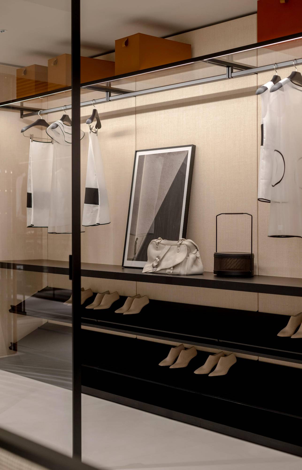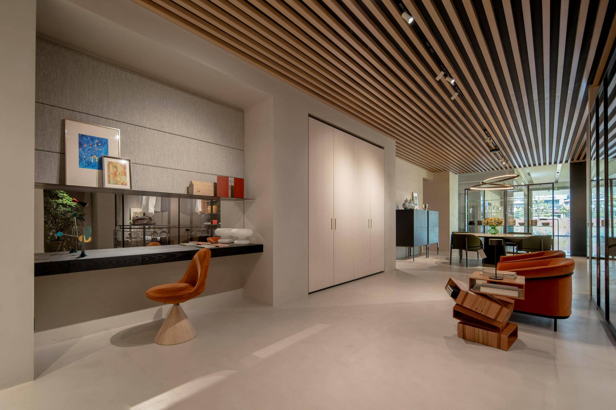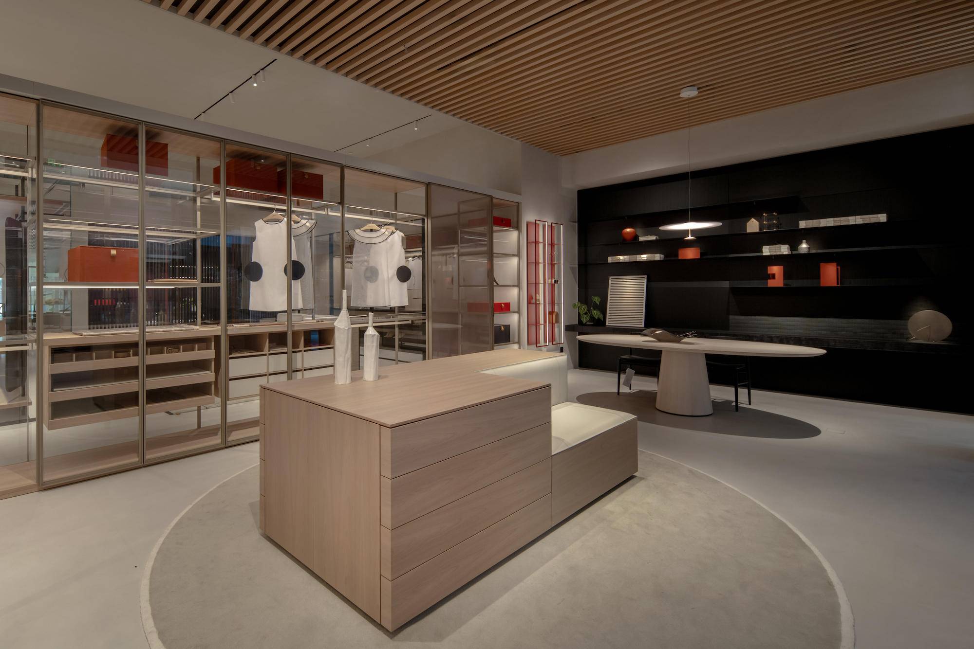 Piero Lissoni 设计的 Boutique Mast 系统用于布置空间并引导人们进入一个小型的休闲区,该系统配有白色樱桃木的悬臂式搁架、铁制立柱、橙红色西恩纳开放式模块和宽面镜子。这里摆放着 GamFratesi 设计的优雅而独特的 Traveler 日式躺椅,其特点是黑色的金属管状框架,线条优美,框架环绕着内部的织物填充物,就像一件有着高翻领的高定时装外套。Porro 的经典之作——Pull - Out Sliding Storage 衣柜,选择了象牙色哑光漆面的门,门内是灰烬色铁杉。