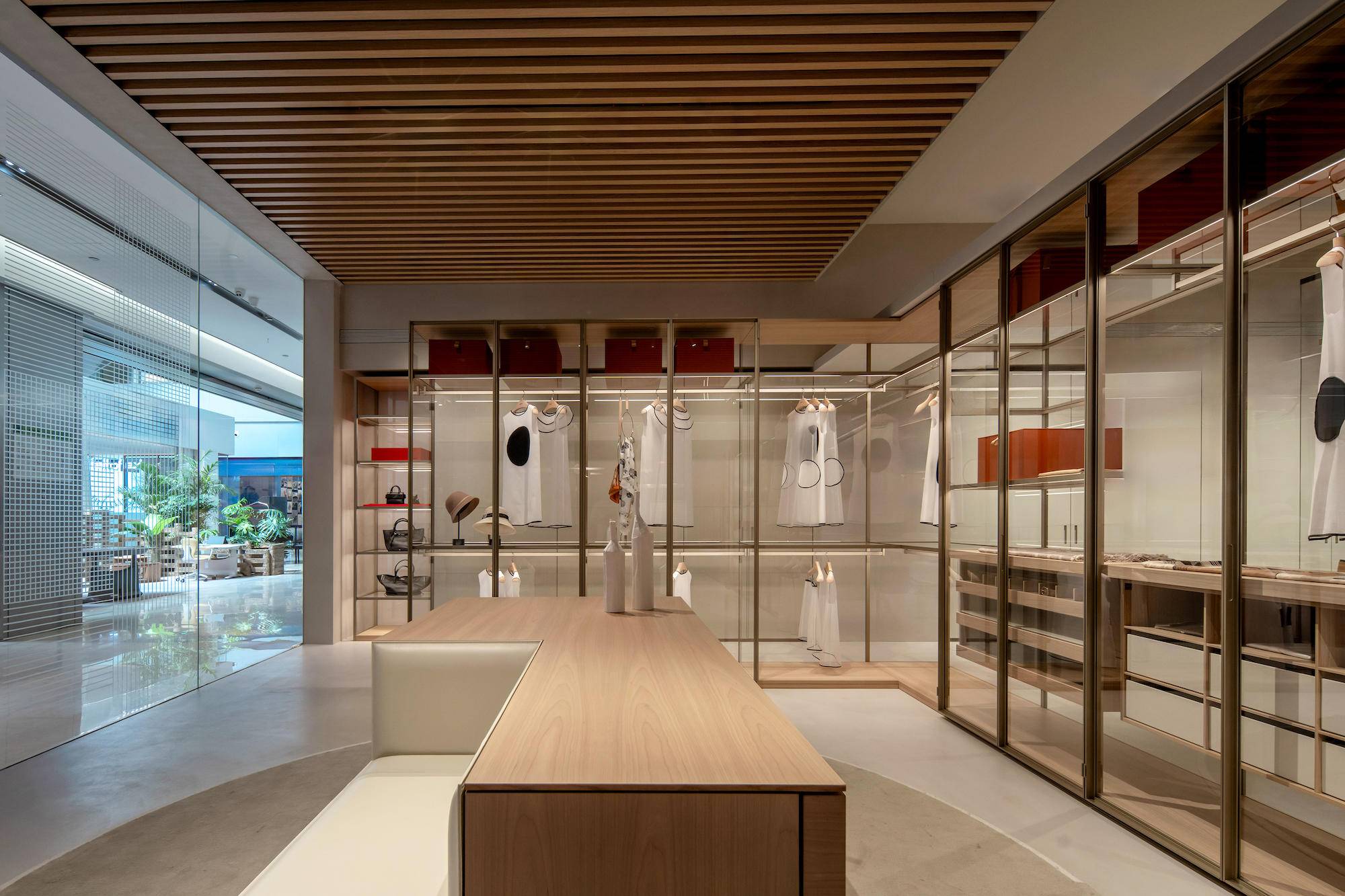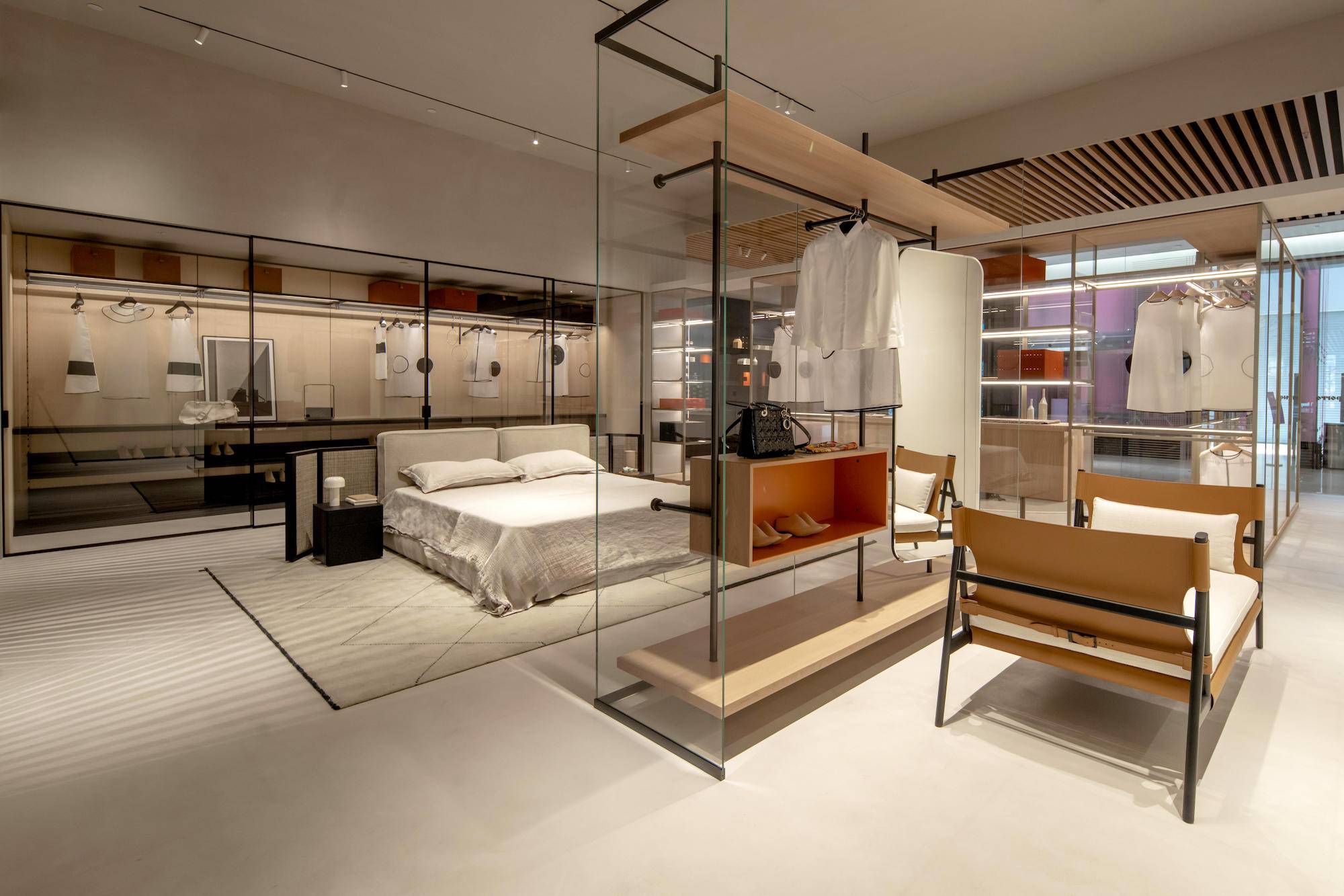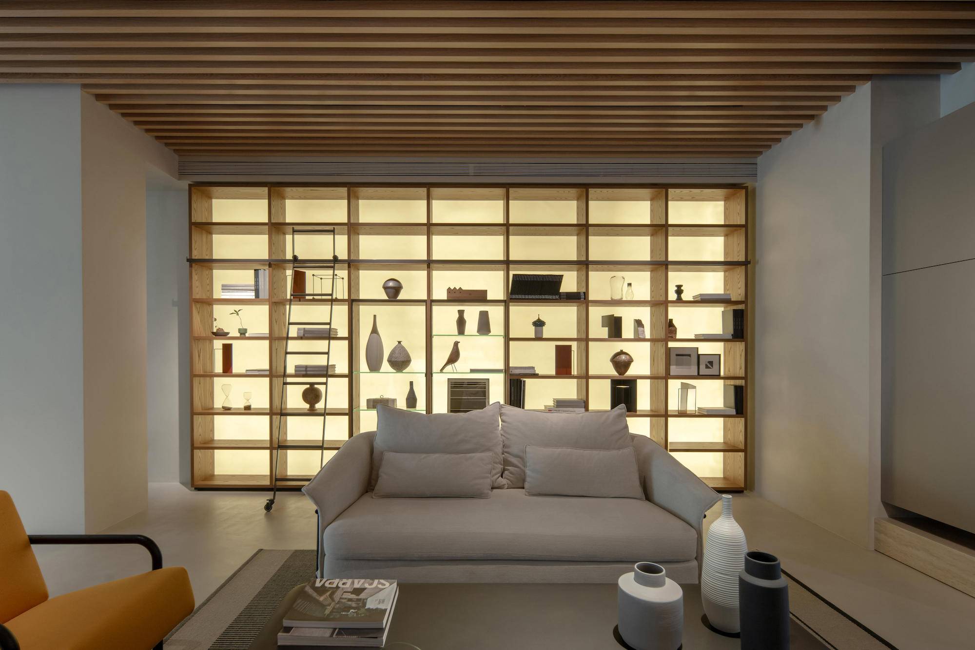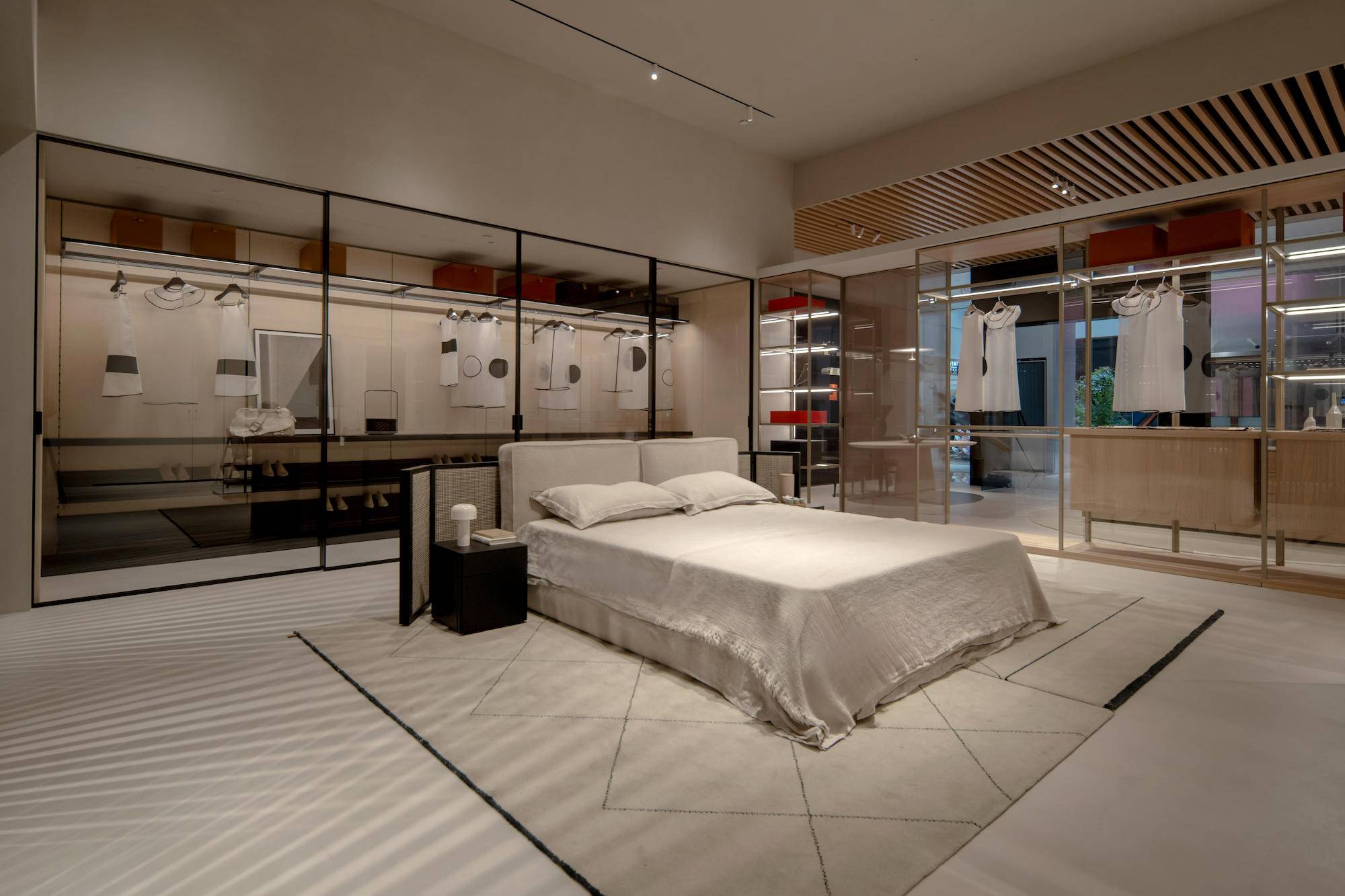 Piero Lissoni 设计的 Boutique Mast 系统用于布置空间并引导人们进入一个小型的休闲区,该系统配有白色樱桃木的悬臂式搁架、铁制立柱、橙红色西恩纳开放式模块和宽面镜子。这里摆放着 GamFratesi 设计的优雅而独特的 Traveler 日式躺椅,其特点是黑色的金属管状框架,线条优美,框架环绕着内部的织物填充物,就像一件有着高翻领的高定时装外套。Porro 的经典之作——Pull - Out Sliding Storage 衣柜,选择了象牙色哑光漆面的门,门内是灰烬色铁杉。