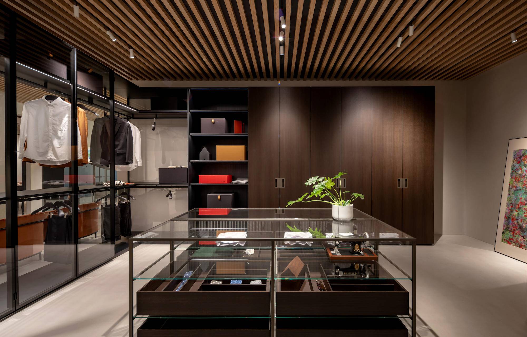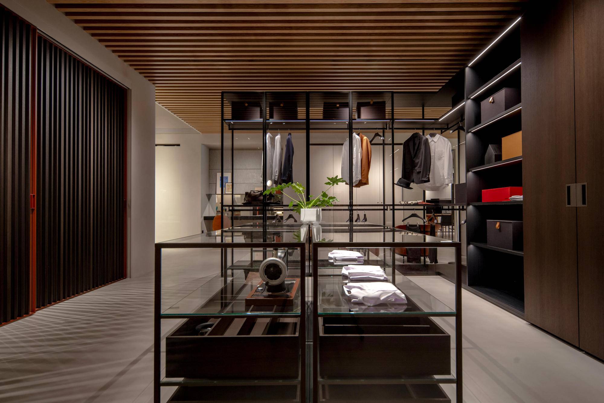 Glide Shanghai 滑动隔断采用经过热处理的橡木板条和中国红框架,通向家的真正核心——由 Piero Lissoni + Porro 研发中心设计的采用黑色杉木的储物角衣帽间。从完全开放或由玻璃门封闭的透明模块,到透明角落解决方案,再到装有 32S 厚经过热处理的橡木门的铰链式储物衣柜,配备奥斯陆把手,整个衣柜完全由木材制成,工艺精湛。两个独立的 Piero Lissoni 设计的 Acquario 抽屉单元,也配有磨光的黄铜框架、玻璃搁板和桉木底座及抽屉,使整个空间和谐统一。