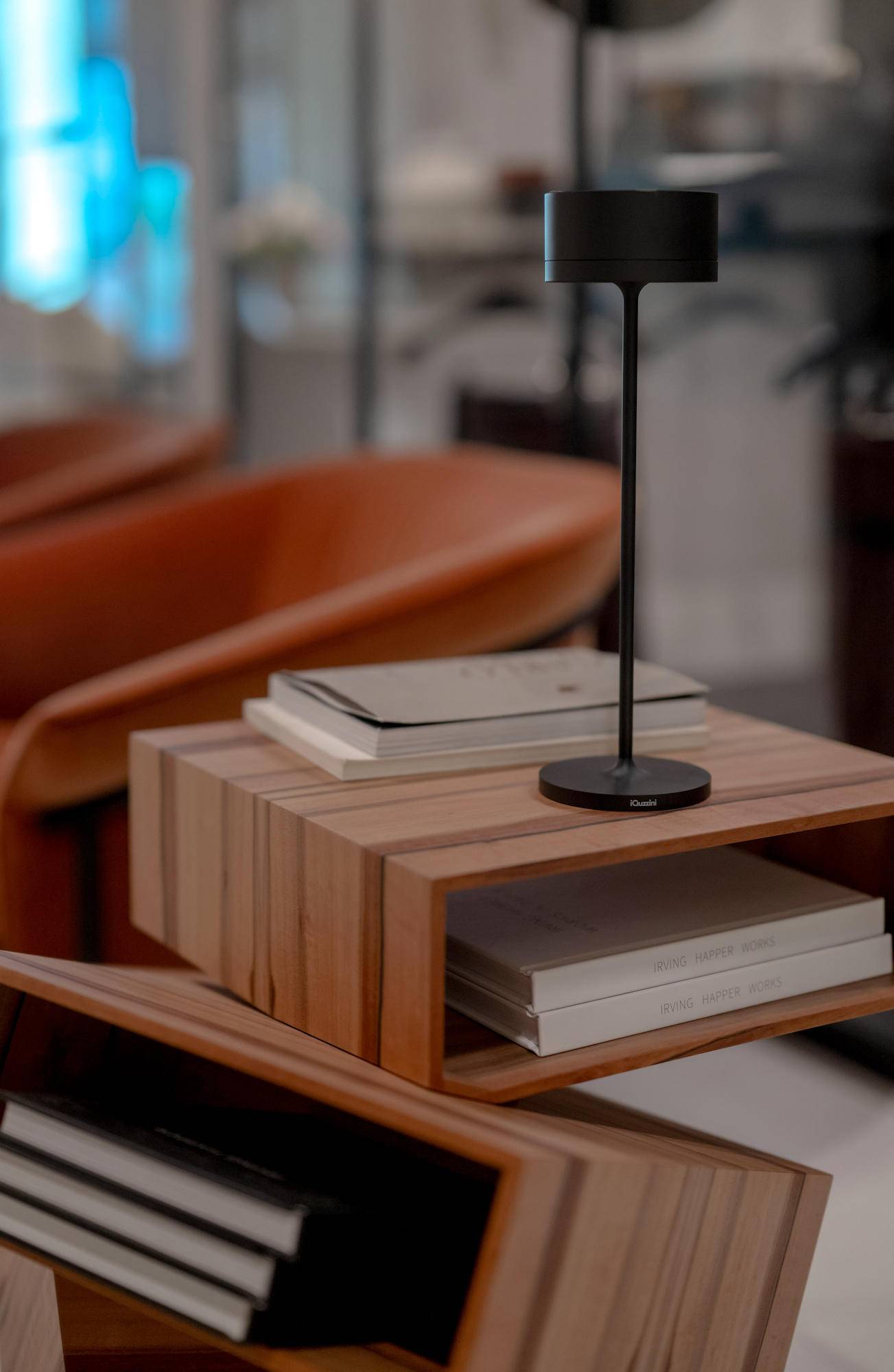 GamFratesi 设计的 Kite 扶手椅,其特点是黑色涂漆的管状框架线条优雅,框架环绕着内部的织物填充物,就像一件有着高翻领的高定时装外套,营造出一个等候区。旁边是瑞典设计师 Front 设计的 Balancing Boxes 咖啡桌,它由一系列不规则堆叠但空间上保持平衡的 Tineo 木箱组成。在壁龛里,Load - it 书架配有黄铜搁板、灰色织物墙板和一面镜子,还搭配了一个现代黑色染色橡木悬浮式顶部,与 GamFratesi 设计的 Romby 椅子完美匹配,该椅子的底座是实心橡木的截锥形。在接下来的壁龛里,铰链式储物衣柜巧妙地结合了白色白蜡木门和侧面、黑色杉木配件以及黑色涂漆的金属立柱,形成了强烈的对比,点亮了整个场景。