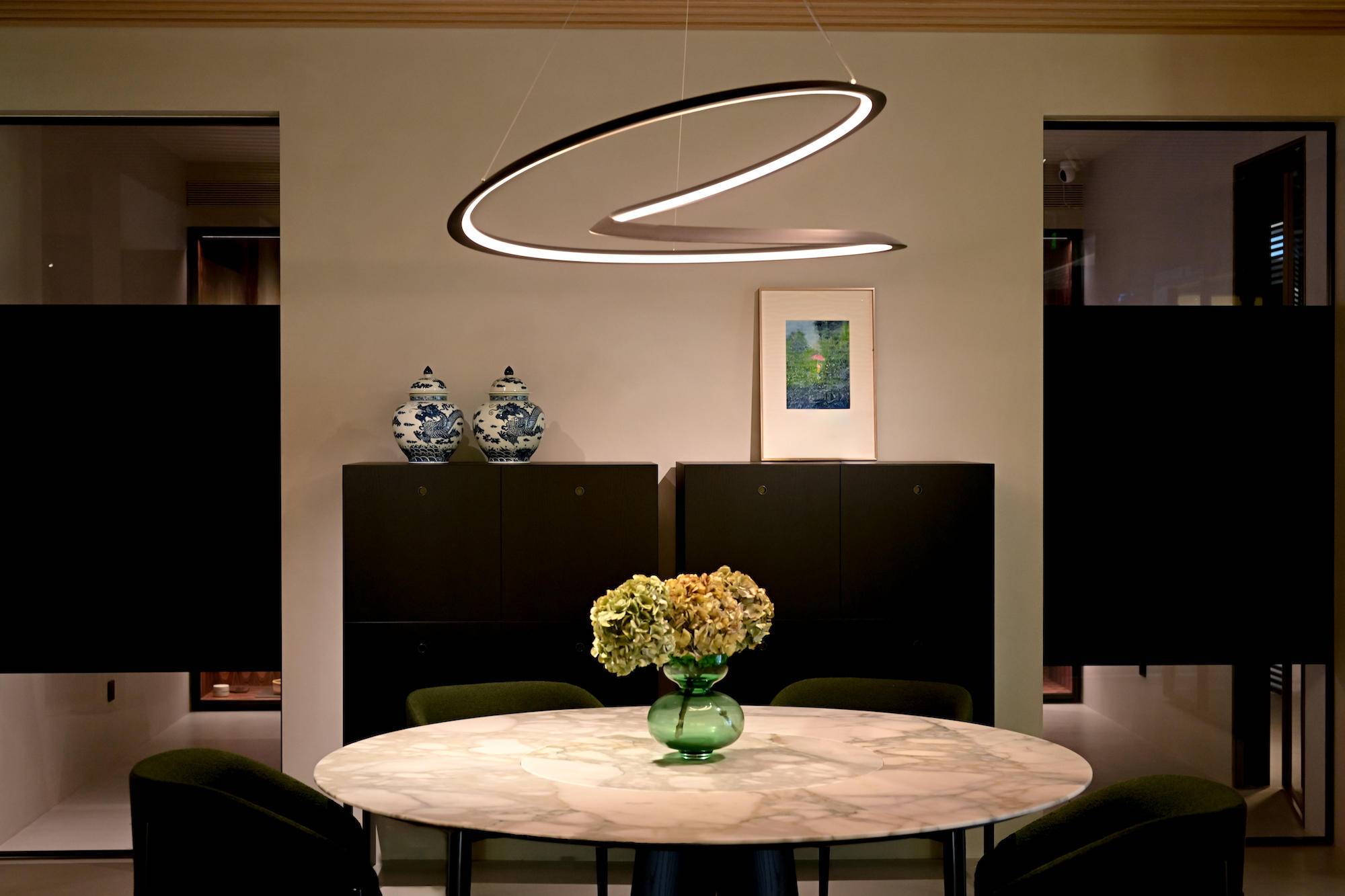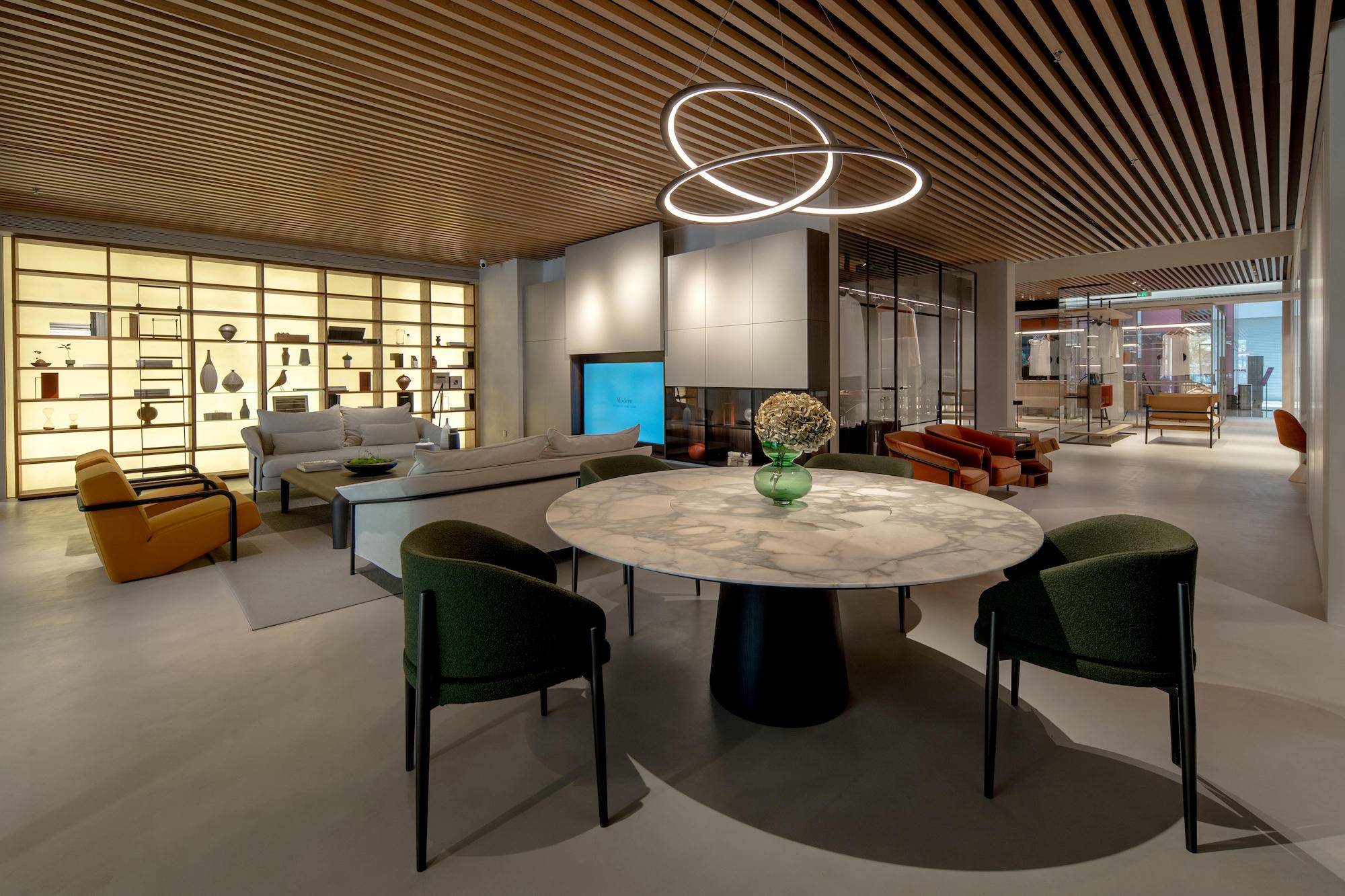 在餐厅里,Piero Lissoni 设计的 Materic 桌展示了其圆形桌面,桌面采用 Calacatta verde 大理石,放置在黑色染色橡木的截锥形底座上,周围环绕着 Piero Lissoni 设计的 Frank 椅子,椅子采用铁框架和织物覆盖,灵感源自法国装饰艺术风格。两款 Piero Lissoni 设计的 Offshore 抽屉单元,采用黑色开放式孔隙染色橡木,由于木材纹理在各个面上连续不断,形成了一个连续的体积,只有内置把手的细节打破了这种连续性。