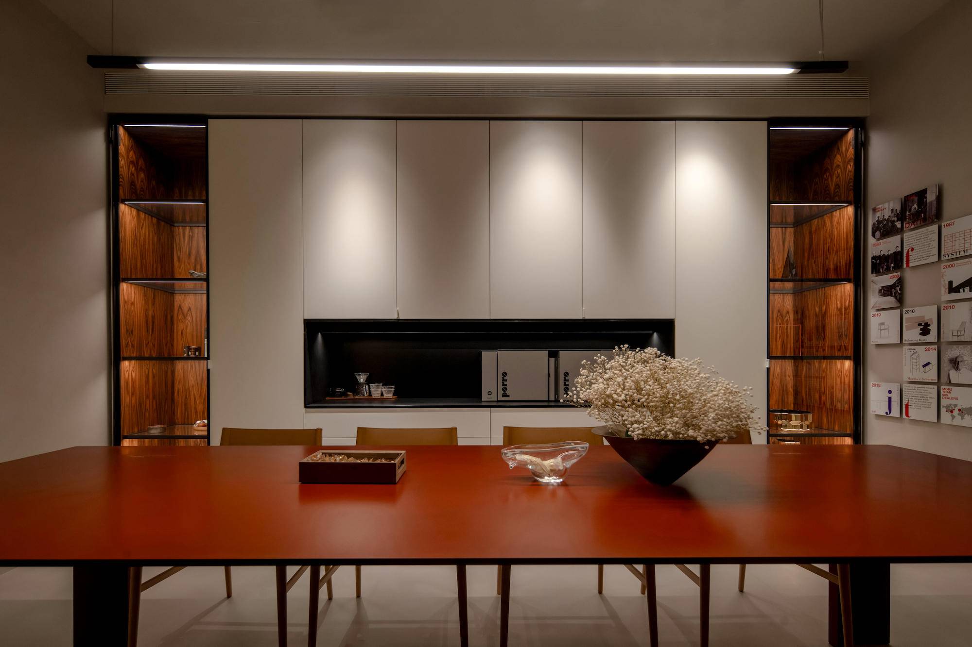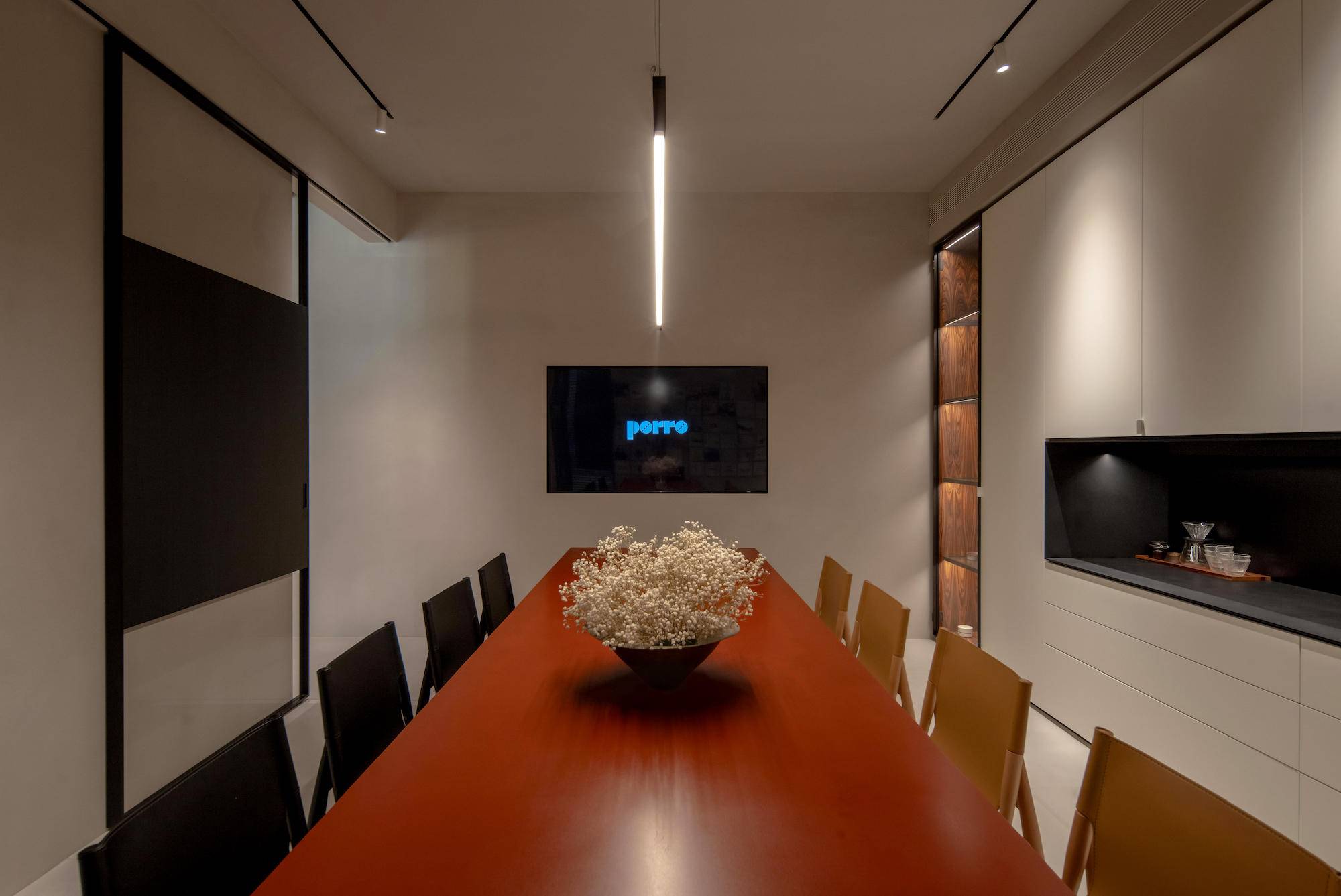 会议室具有强烈的个性,配备了 Piero Lissoni 设计的 Metallico 桌,其采用了独特的古董红色饰面,搭配 GamFratesi 设计的 Voyage 椅子,椅子的结构采用天然或黑色染色的枫木,外面紧贴着一层鞍皮。