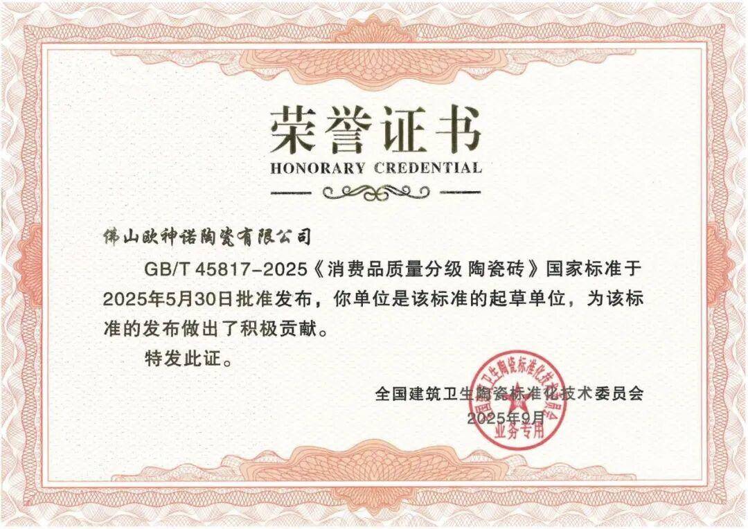 2025年12月1日,GB/T 45817-2025《消费品质量分级陶瓷砖》国家标准将正式实施,标志着我国陶瓷砖行业迈入"等级化品质时代"。在此行业变革节点,欧神诺瓷砖传来双重喜讯:其送检产品于近日率先通过国家级检测机构检测,符合新国标最高等级AAAAA级要求;同时,作为该标准的起草单位之一,欧神诺获颁官方荣誉证书,以双重身份彰显头部企业的技术实力与行业担当。