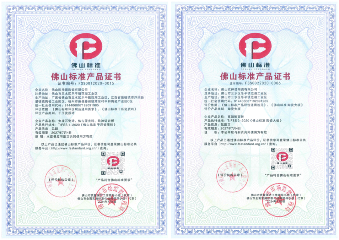 一直以来,欧神诺坚持严苛的质量管理体系和比肩世界水准的标准定位,产品内控标准严于国家及欧盟要求,并通过ISO14001、ISO9001等权威认证。早在2021年,欧神诺就成为首批通过"佛山标准"认证的企业之一,代表着中国建陶制造的最高标准水平。