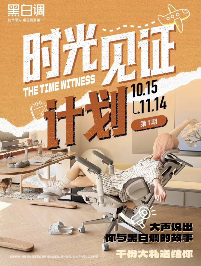发布会上,黑白调正式启动“黑白调时光见证计划”感恩回馈活动,面向所有用户征集故事内容,并准备了100把旗舰人体工学椅及大额现金奖励,作为回馈。活动将从今年10月15日开始,分为两个阶段,持续2个月。
