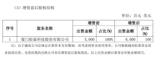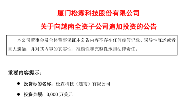 而此次追加投资,是基于对下游海外客户市场需求的深入评估。松霖科技在公告中表示,增资完成后,公司在越南子公司的总投资额将达到8000万美元。这一举措不仅体现了公司对越南市场前景的看好,也反映了其积极应对全球供应链格局变化的战略眼光。