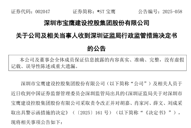 根据公司10月18日发布的公告,深圳证监局经过调查发现,宝鹰建设在工程管理、采购管理、资金管理方面的内部控制存在明显缺陷,同时2024年12月一笔关联方现金捐赠的信息披露也不准确。这些问题不仅导致公司被采取责令改正的监管措施,时任董事长胡嘉、总经理肖家河、时任财务总监薛文、董事会秘书刘成等四位核心高管也一并被出具警示函。