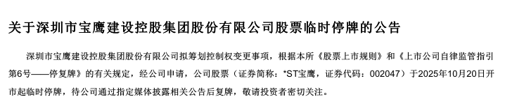 10月19日,深圳证券交易所一纸停牌公告将宝鹰建设推至风口浪尖。公告显示,该公司因“拟筹划控制权变更事项”自当日开市起临时停牌。然而,就在停牌前两天,公司刚刚公告收到深圳证监局下达的行政监管措施决定书,被指出存在严重内控缺陷及信披问题。两起重大事件在三天内接连爆发,为这场看似寻常的控制权变更蒙上了一层迷雾。