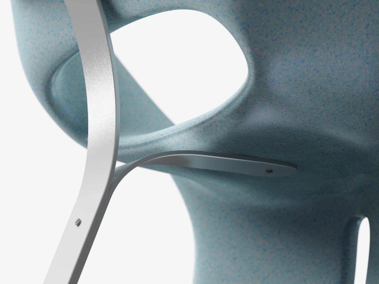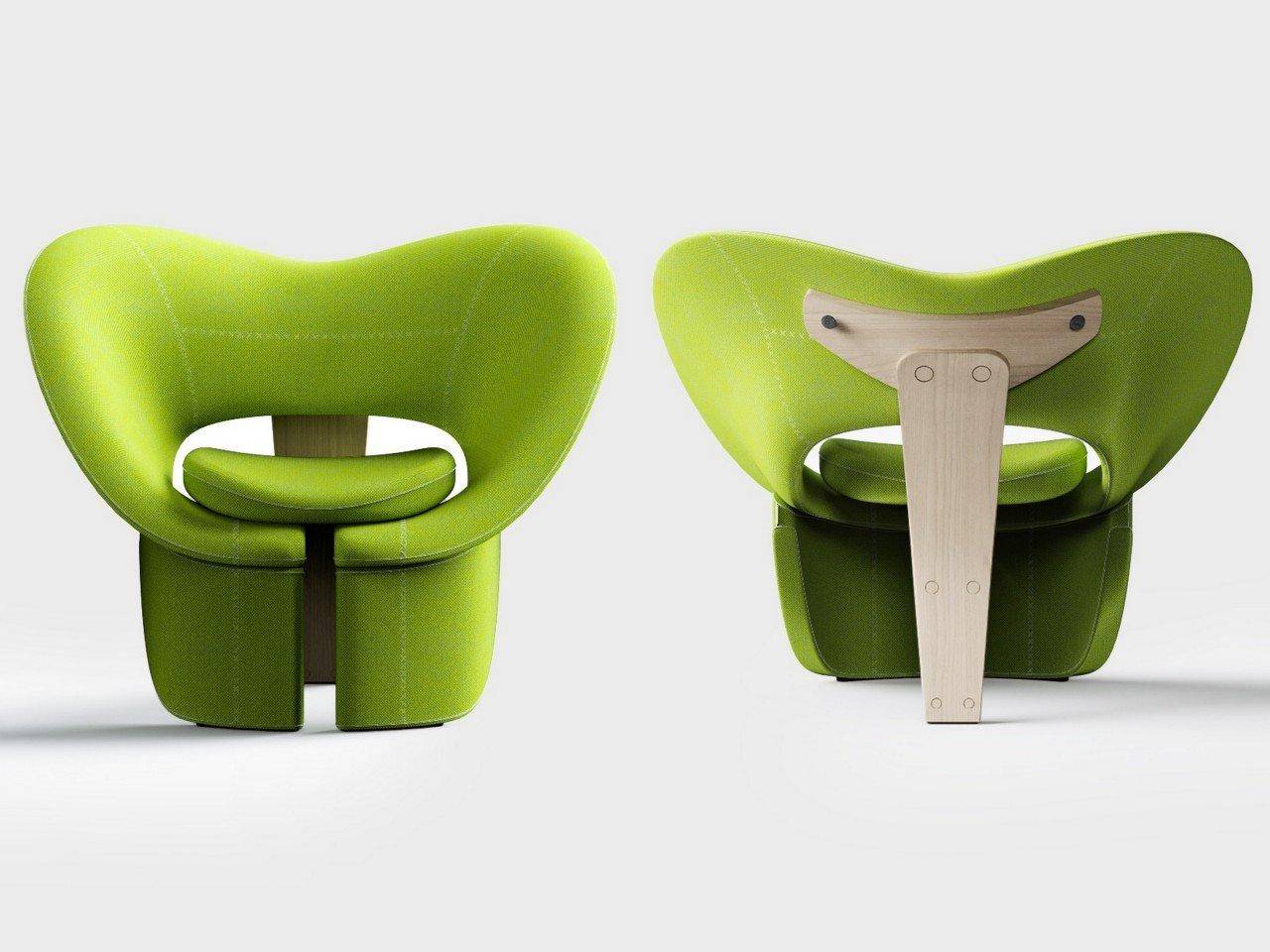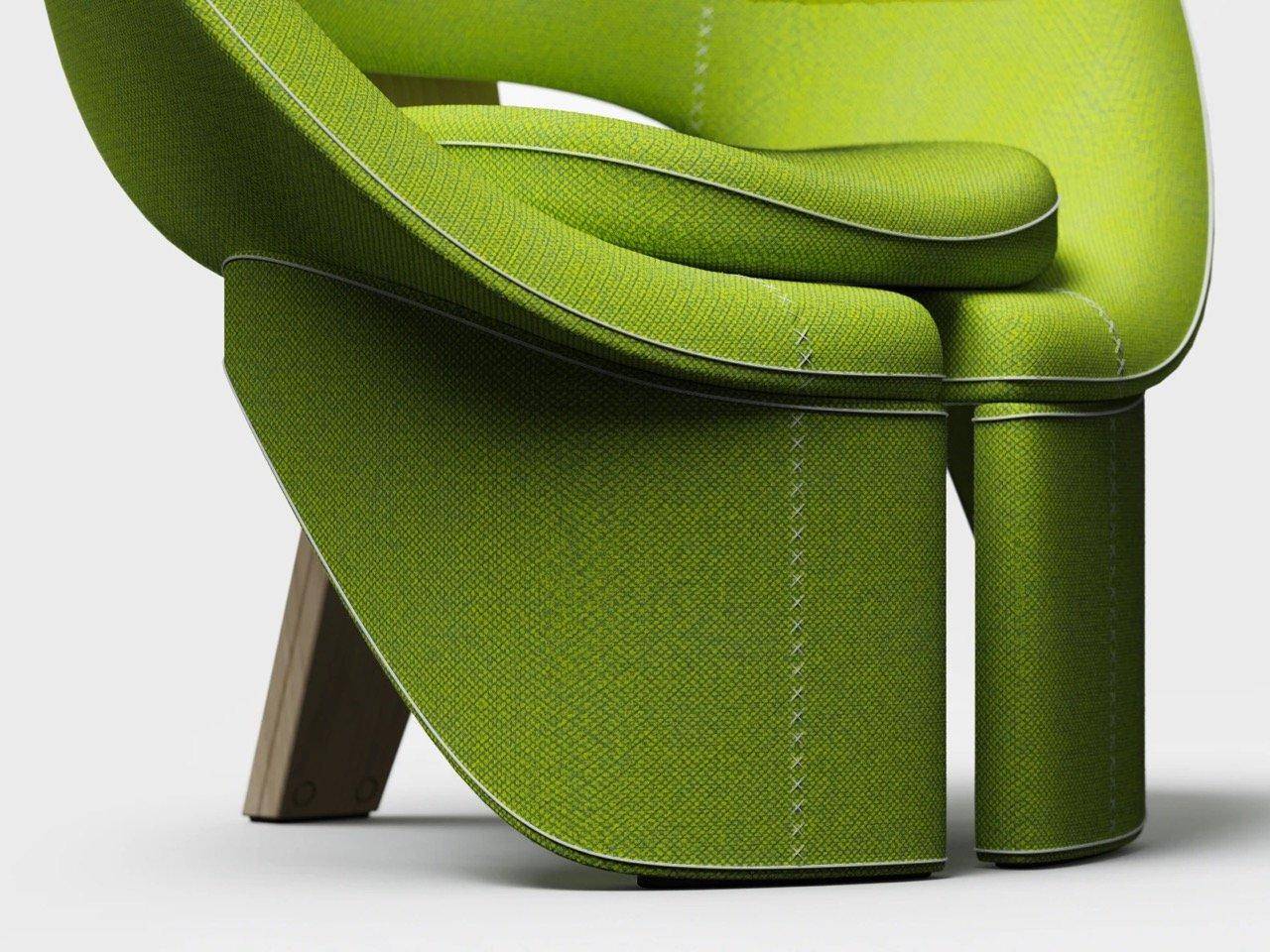 椅子采用两种材质方案:绿色布面款选用厚实纺织品,织纹明显,结合十字缝线细节,既强调耐用性,又凸显手工定制质感;蓝色复合树脂款则更具雕塑感和公共空间适用性。支撑结构为Y型脚架,可选铝合金或浅色木材(白蜡木、橡木),外露紧固件呈现工程感。
