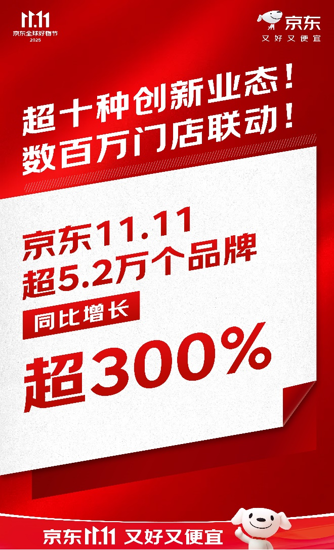2025年京东11.11全球好物节已正式启动,并展现出强劲的消费增长势头。根据京东于10月21日发布的阶段性战报,截至10月20日18时,本次大促成交额增长迅猛,超过5.2万个品牌成交额同比增长超过300%,同时有超过3300个品类的成交额实现同比翻倍。