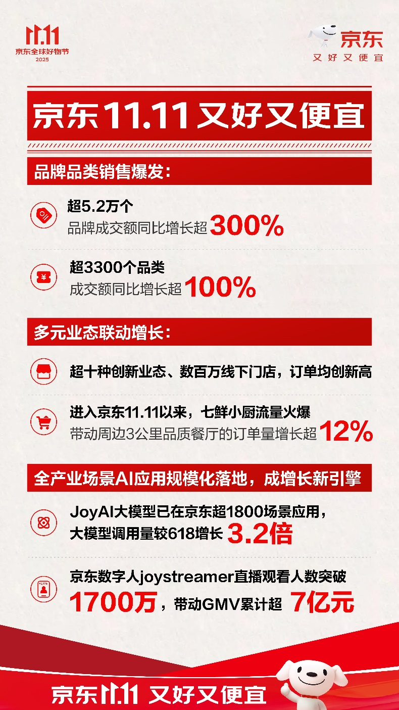 本次京东11.11的一大亮点是创新业态的集中亮相。京东外卖、七鲜小厨、七鲜美食MALL、京东折扣超市、京东医美等十余种创新业务首次参与大促,客流量与订单量持续攀升。线下消费同样活跃,包含京东家电专卖店、京东MALL、3C数码门店在内的全国数百万家线下门店协同联动,获得销售大幅增长。数据显示,以京东之家、京东电脑数码专卖店为代表的京东3C数码门店数量已突破4000家,成交额同比增长120%;全国26家京东MALL整体成交额同比增长86%;京东养车到店服务订单量同比增长超2倍。