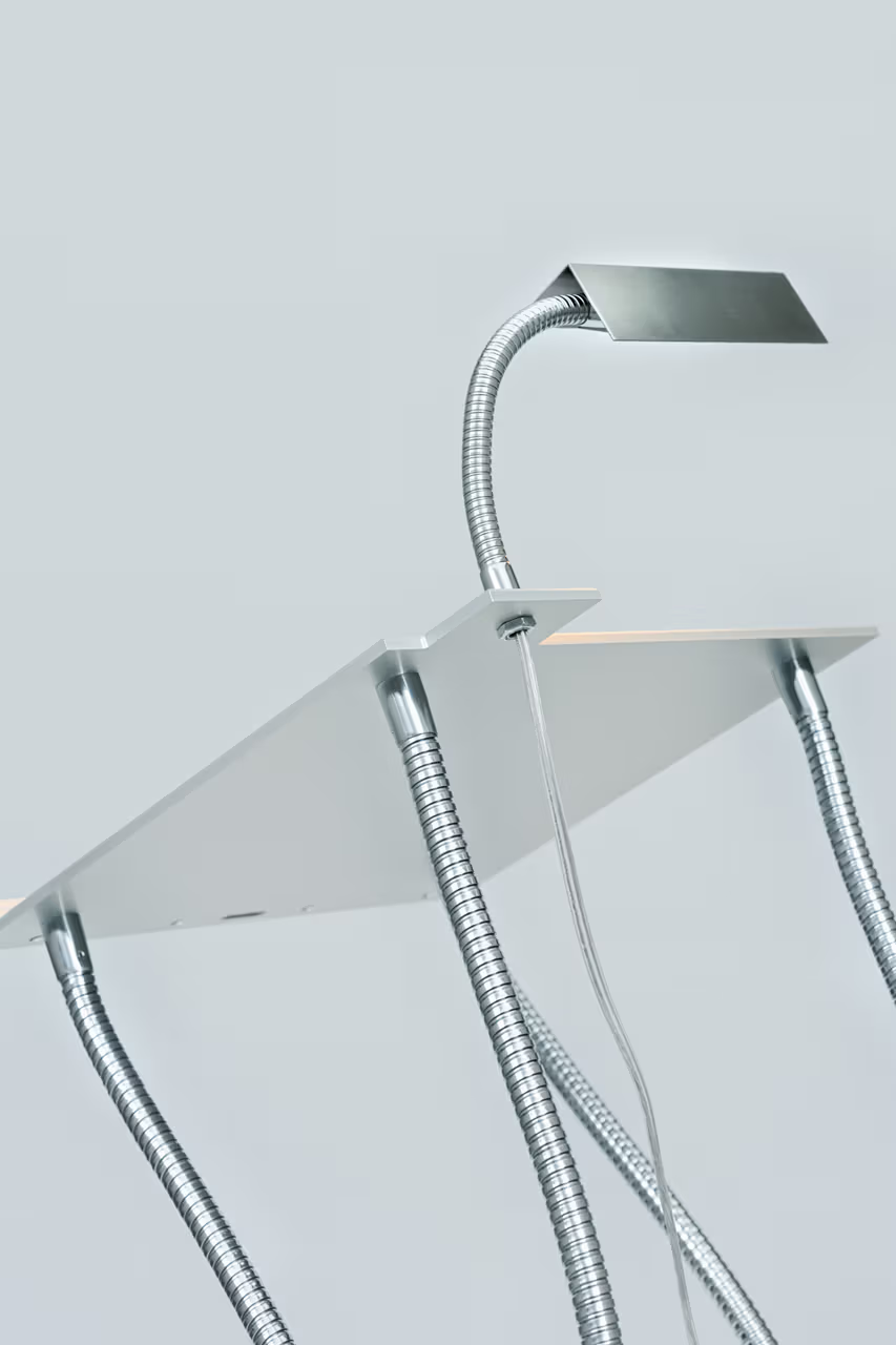 在首尔设计工作室p(erson)al的《Soft Syntax》展览中,一个我们日常生活中熟悉的工业部件——“鹅颈管”,完成了从功能零件到智能家具的华丽转身。这种常见于台灯和麦克风的柔性结构,在设计师Woojin Park手中焕发出全新的生命力。