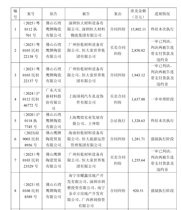 根据公告披露的诉讼历程,石湾鹰牌于2022年11月向法院提起民事诉讼,要求恒大地产集团郑州有限公司返还借款及支付利息等合计约6197万元。法院于2023年2月作出一审判决,支持了石湾鹰牌的诉讼请求。被告虽曾提出上诉,但因未缴纳上诉费被按自动撤回上诉处理,一审判决随之生效。然而,胜判决并未能顺利转化为真金白银,进入执行阶段后,因未发现被执行人可供执行的财产,法院最终作出了终结本次执行的裁定。